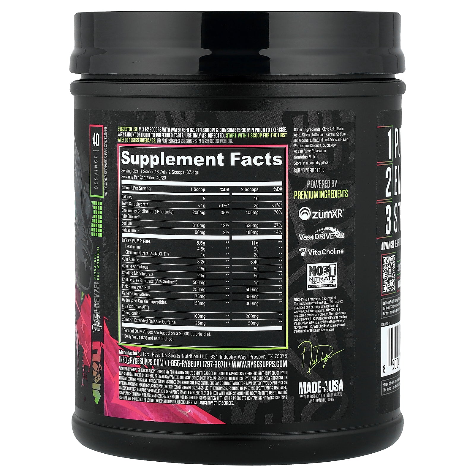 RYSE Up™ products are intended only for healthy adults over the age of 18. Consult a physician before using this product if you have a medical condition or if you are taking any medications or other dietary supplements. Do not use if you are currently pregnant or nursing, could be pregnant, or are attempting to become pregnant. Discontinue use and contact a doctor immediately if you experience an irregular or rapid heart beat, chest pain, shortness of breath, dizziness, lightheadedness, fainting or presyncope, tremors, headache, nausea, or other similar symptoms. If you are a performance athlete, please check with your sanctioning body prior to use to ensure compliance contains nitrates and generally should not be used in combination with other products containing nitrates. Contains caffeine and should not be used in combination with alcohol or stimulants from other sources.