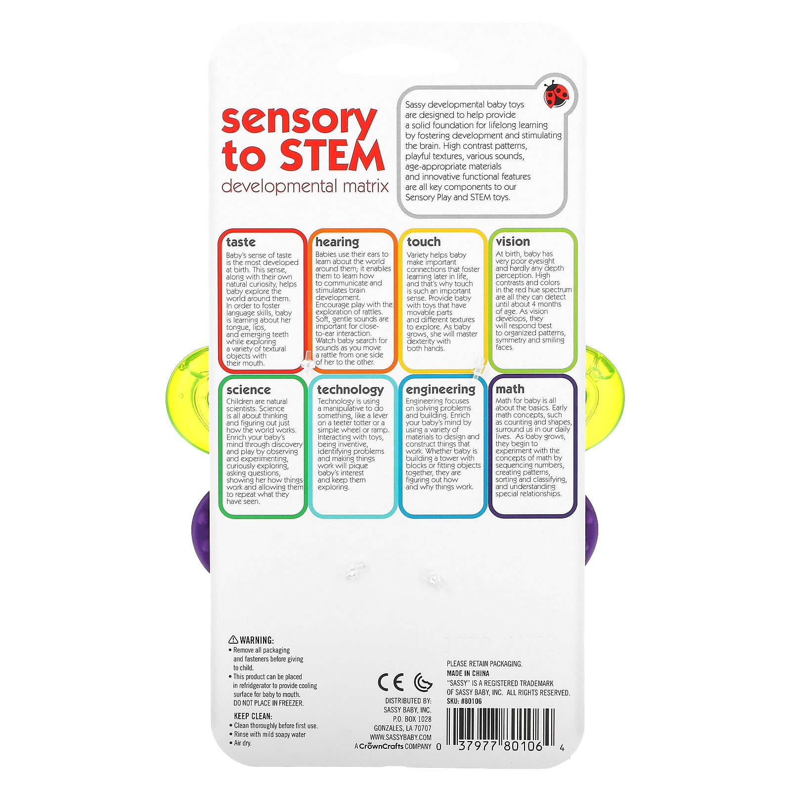 Sassy developmental baby toys are designed to help provide a solid foundation for lifelong learning by fostering development and stimulating the brain. High contrast patterns, playful textures, various sounds, age-appropriate materials and innovative functional features are all key components to our Sensory Play and STEM toys.