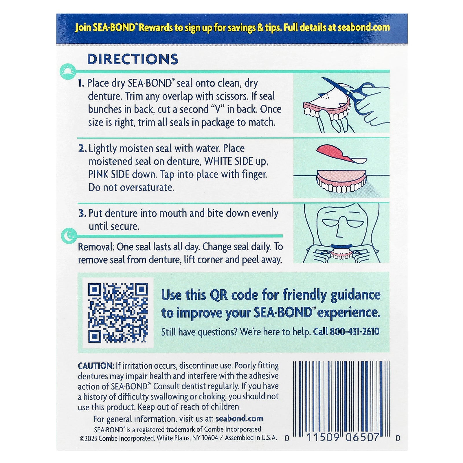 If irritation occurs, discontinue use. Poorly fitting dentures may impair health and interfere with the adhesive action of Sea-Bond®. Consult dentist regularly. If you have a history of difficulty swallowing or choking, you should not use this product. Keep out of reach of children.
