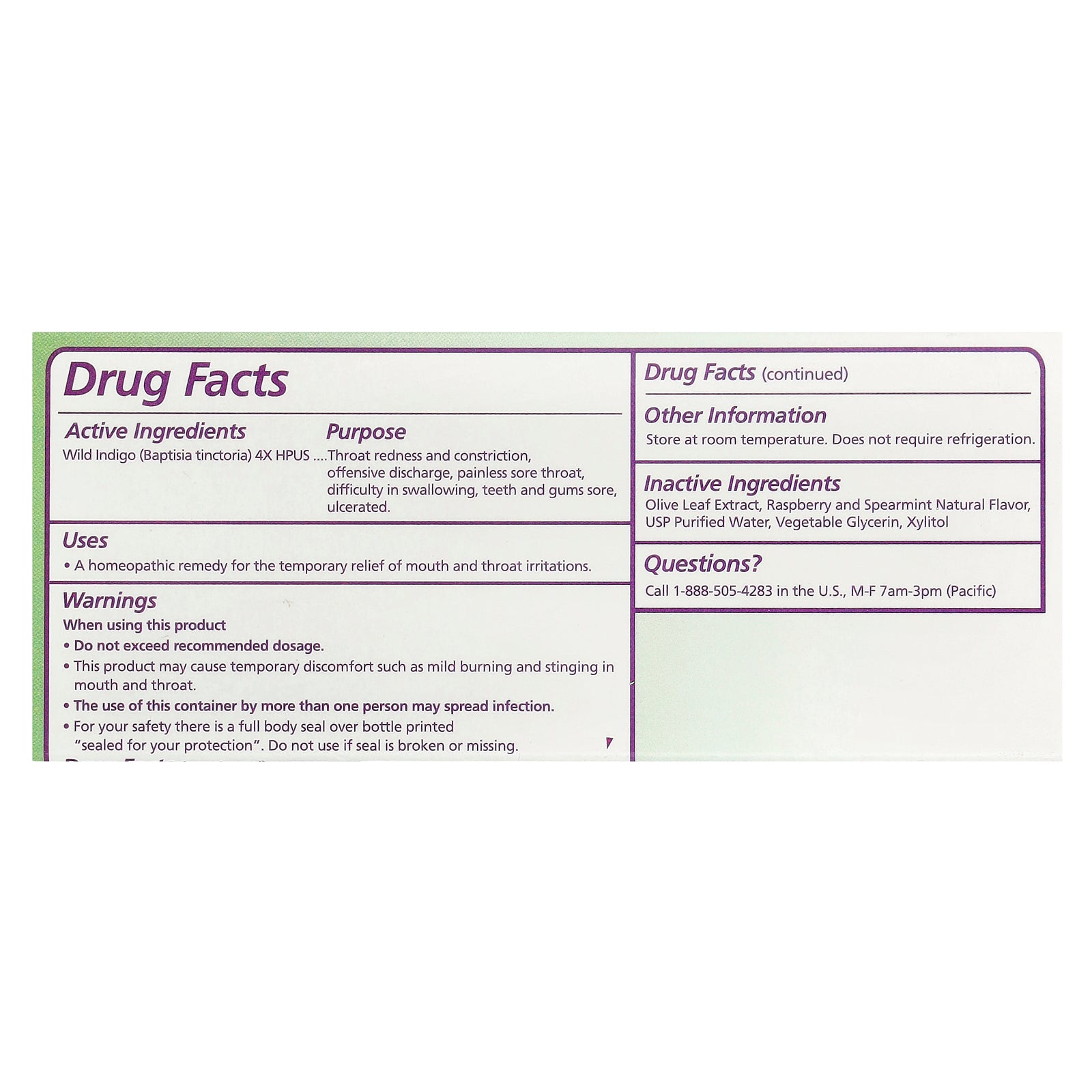 | Inactive Ingredients: Olive leaf extract, raspberry and spearmint natural flavor, USP purified water, vegetable glycerin, xylitol. |