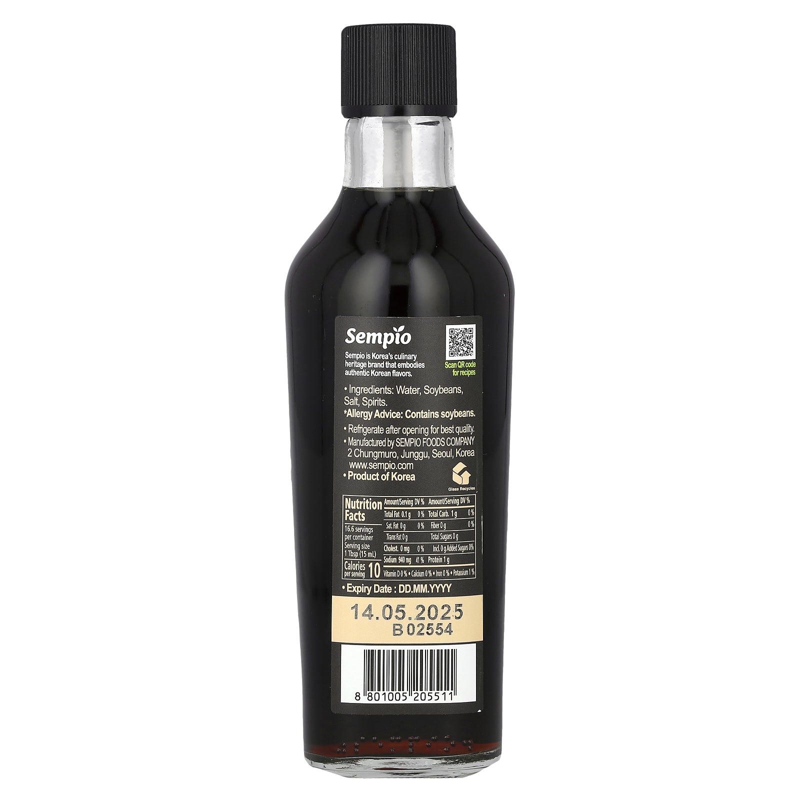 Water, soybeans, salt, spirits.