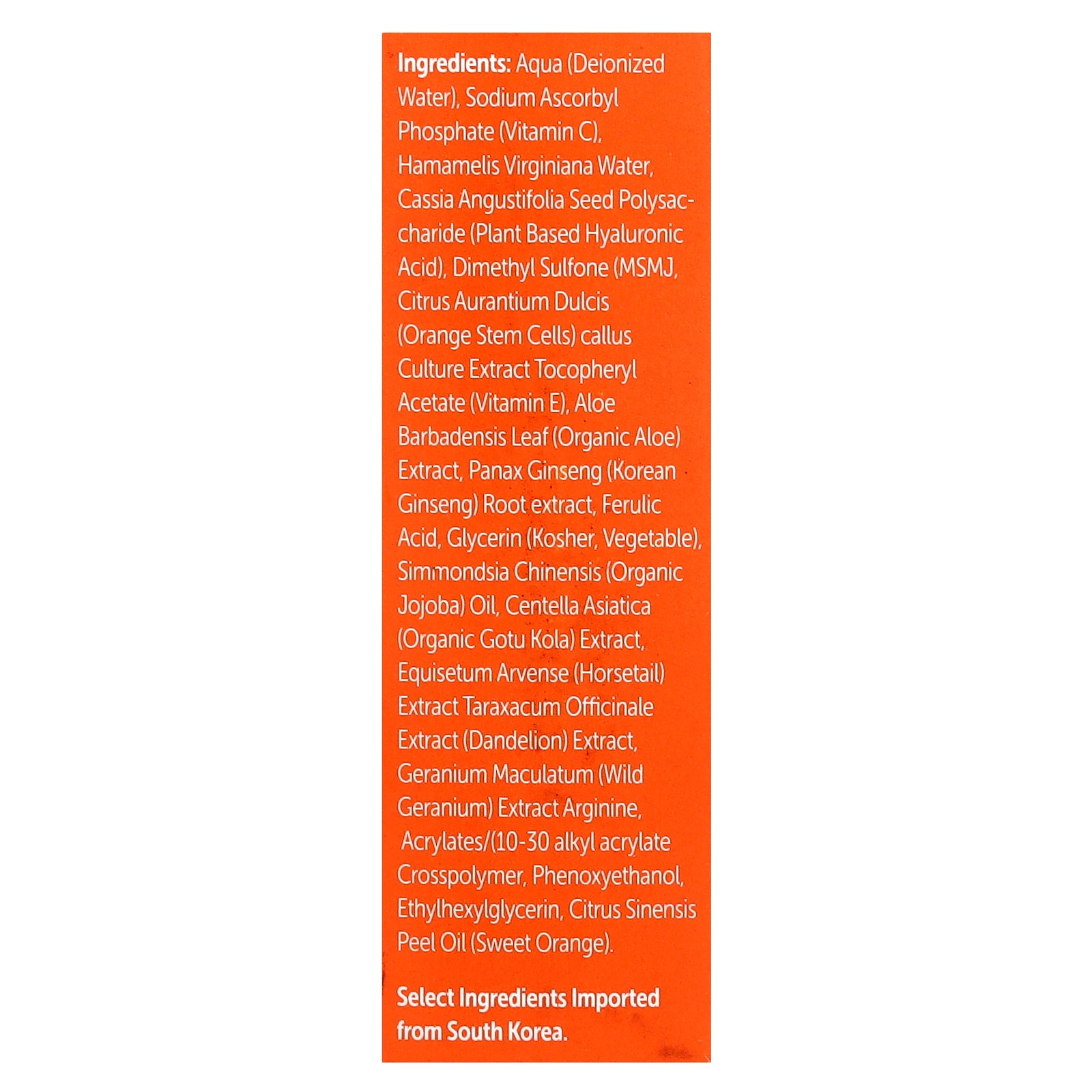 Aqua (deionized water), sodium ascorbyl phosphate (vitamin c), hamamelis virginiana water, cassia angustifolia seed polysaccharide (plant based hyaluronic acid), dimethyl sulfone (msmj, citrus aurantium dulcis (orange stem cells) callus culture extract tocopheryl acetate (vitamin e), aloe barbadensis leaf (organic aloe) extract, panax ginseng (korean ginseng) root extract, ferulic acid, glycerin (kosher, vegetable), simmondsia chinensis (organic jojoba) oil, centella asiatica (organic gotu kola) extract, equisetum arvense (horsetail) extract taraxacum officinale extract (dandelion) extract, geranium maculatum (wild geranium) extract arginine, acrylates/(10-30 alkyl acrylate crosspolymer, phenoxyethanol, ethylhexylglycerin, citrus sinensis peel oil (sweet orange).