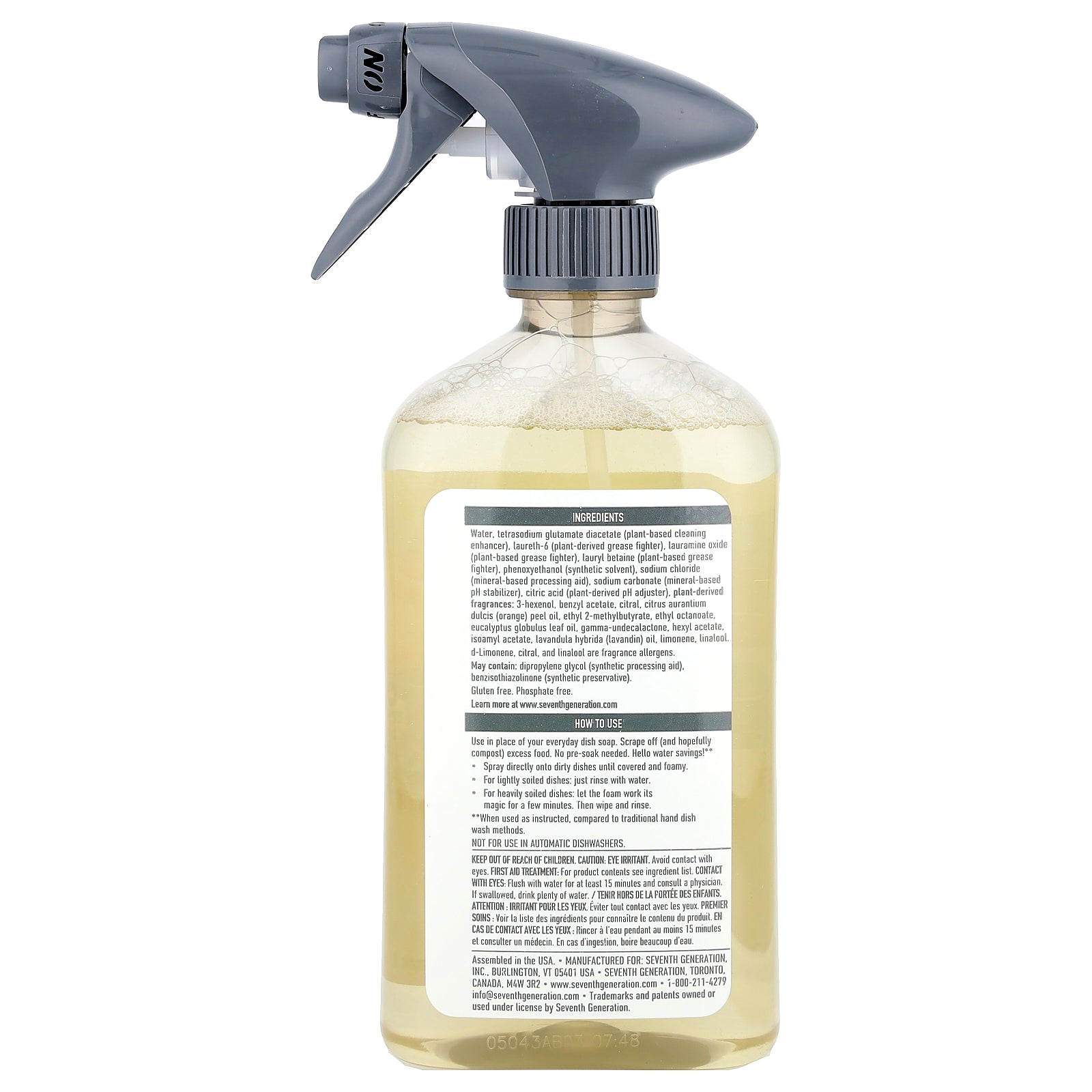 Water, tetrasodium glutamate diacetate (plant-based cleaning enhancer), laureth-6 (plant-derived grease fighter), lauramine oxide (plant-based grease fighter), lauryl betaine (plant-based grease fighter), phenoxyethanol (synthetic solvent), sodium chloride (mineral-based processing aid), sodium carbonate (mineral-based pH stabilizer), citric acid (plant-derived pH adjuster), plant-derived fragrances: 3-hexenol, benzyl acetate, citral, citrus aurantium dulcis (orange) peel oil, ethyl 2-methylbutyrate, ethyl octanoate, eucalyptus globulus leaf oil, gamma-undecalactone, hexyl acetate, isoamyl acetate, lavandula hybrida (lavandin) oil, limonene, linalool. d-Limonene, citral, and linalool are fragrance allergens.