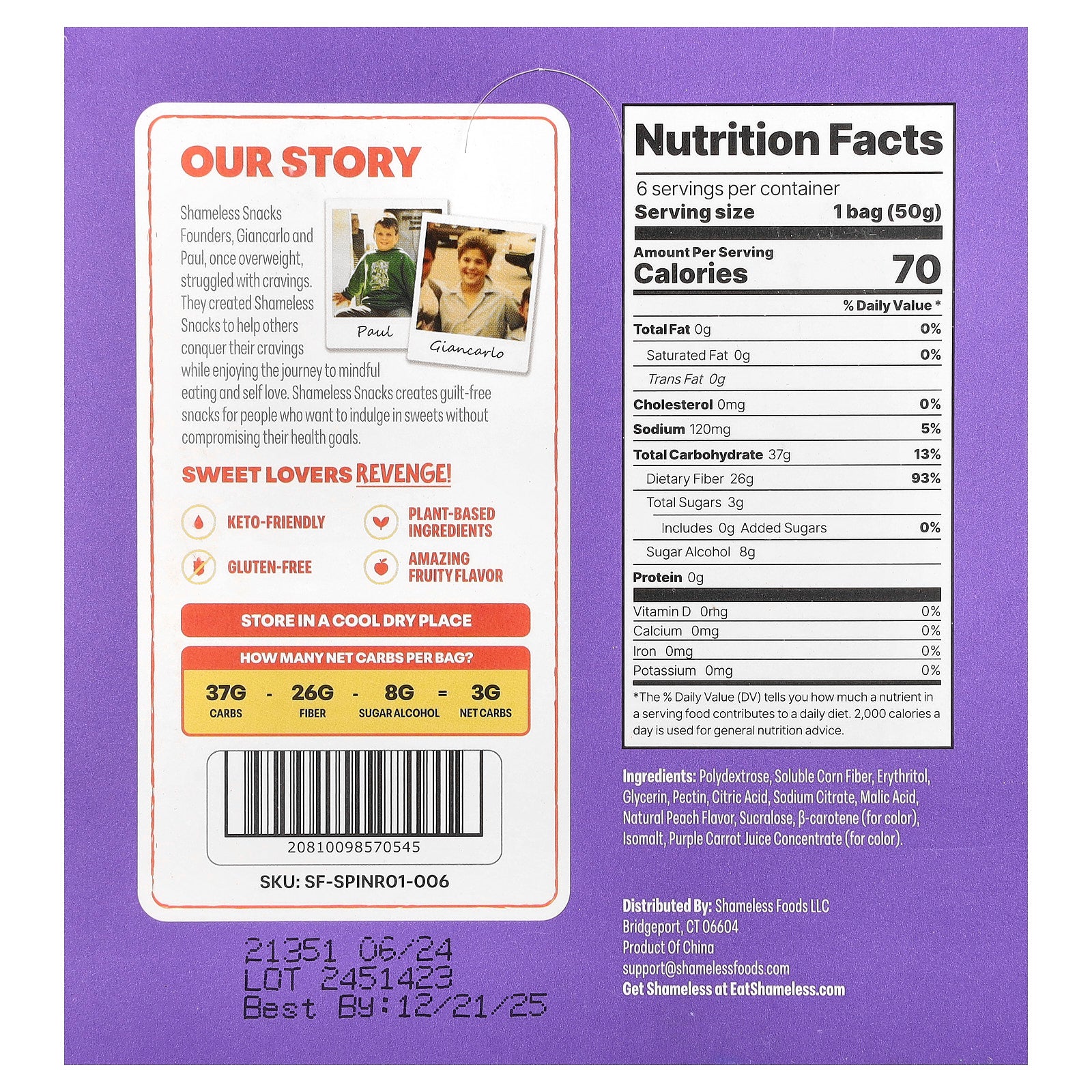 Polydextrose, soluble corn fiber, erythritol, glycerin, pectin, citric acid, sodium citrate, malic acid, natural peach flavor, sucralose, ß-carotene (for color), isomalt, purple carrot juice concentrate (for color).
