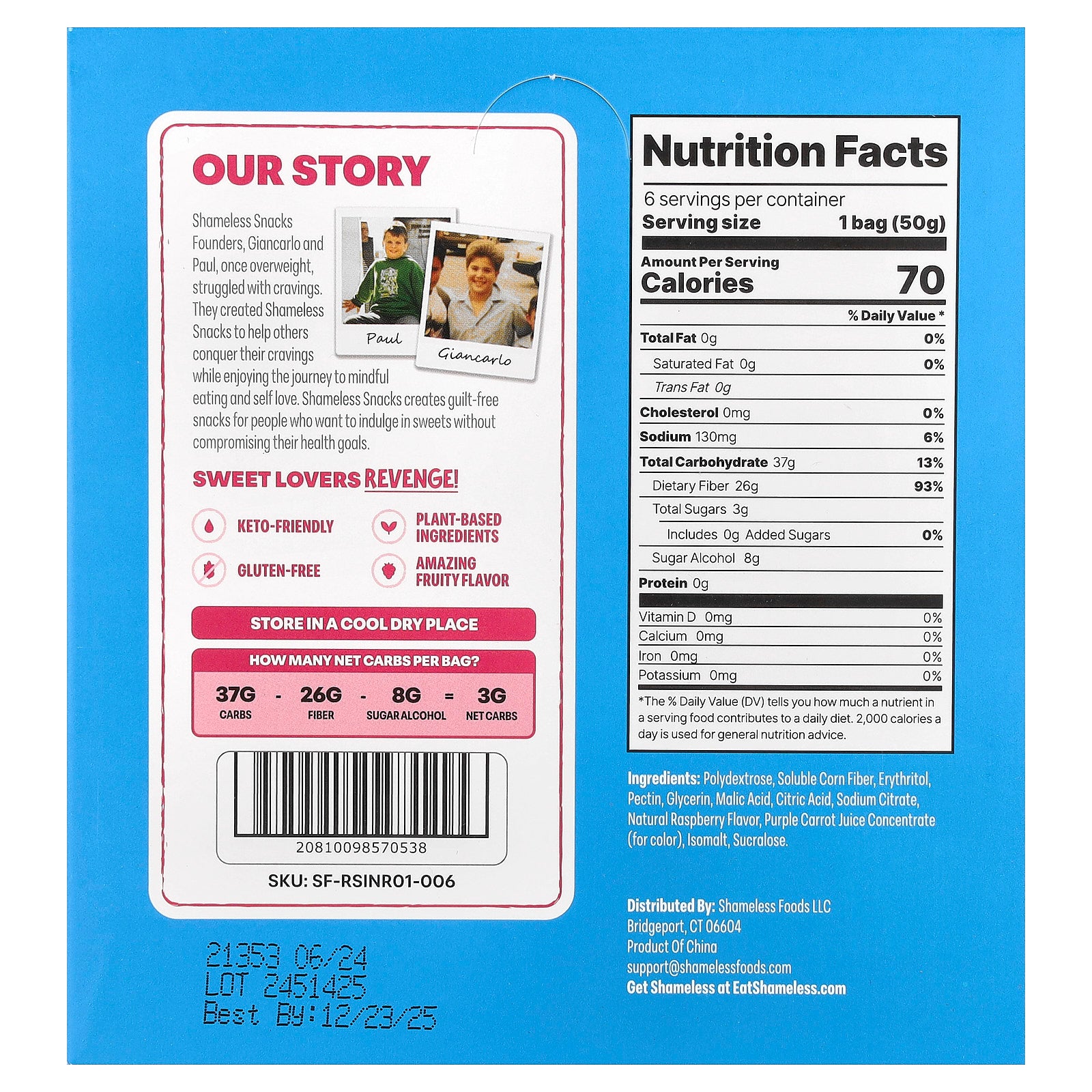 Polydextrose, soluble corn fiber, erythritol, pectin, glycerin, malic acid, citric acid, sodium citrate, natural raspberry flavor, purple carrot juice concentrate (for color), isomalt, sucralose.