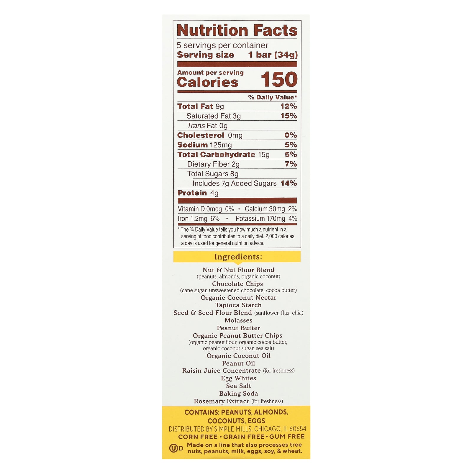 Nut & nut flour blend (peanuts, almonds, organic coconut), chocolate chips (cane sugar, unsweetened chocolate, cocoa butter), organic coconut nectar, tapioca starch, seed & seed flour blend (sunflower, flax, chia), molasses, peanut butter, organic peanut butter chips (organic peanut flour, organic cocoa butter, organic coconut sugar, sea salt), organic coconut oil, peanut oil, raisin juice concentrate (for freshness), egg whites, sea salt, baking soda, rosemary extract (for freshness).