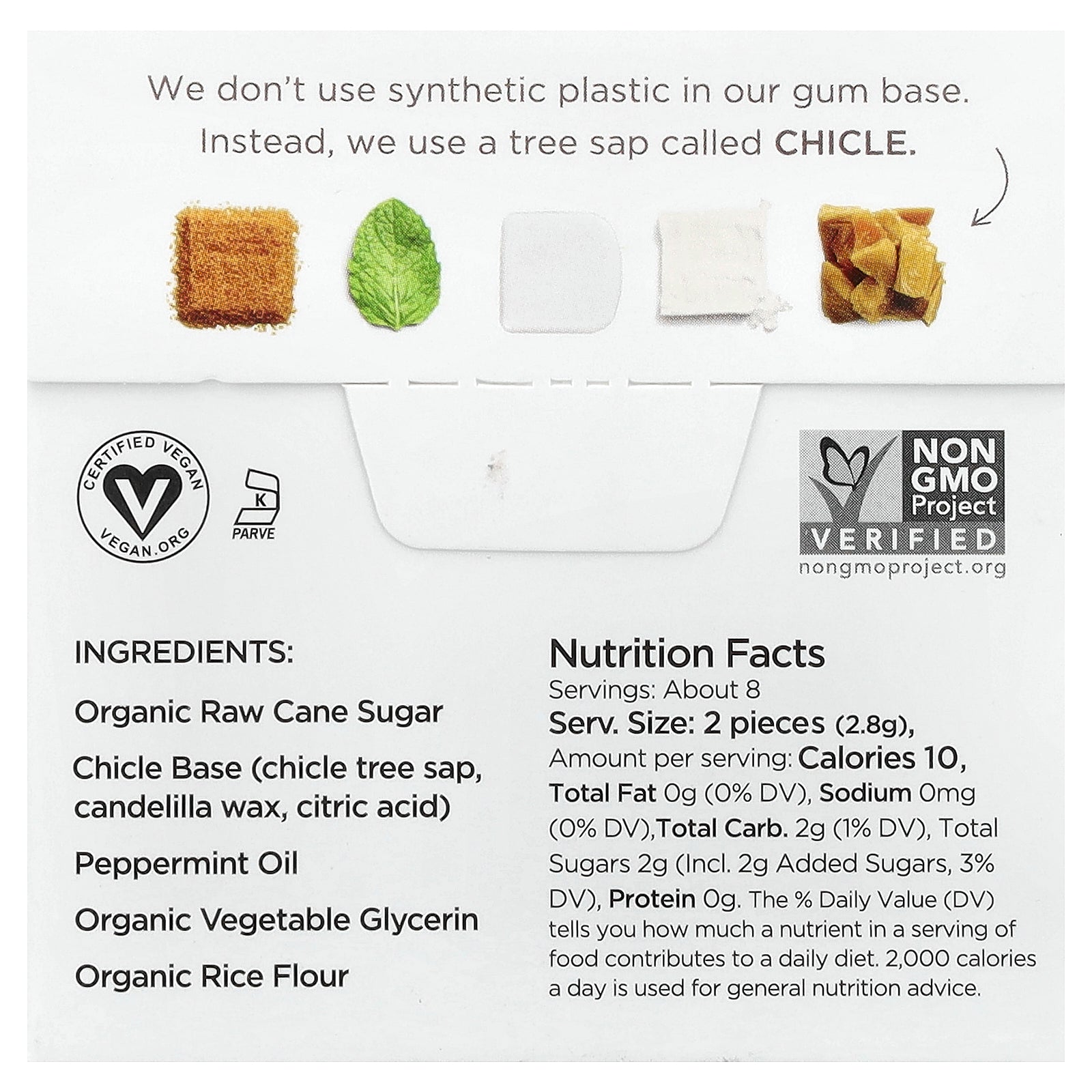 Organic raw cane sugar, chicle base (chicle tree sap, candelilla wax, citric acid), peppermint oil, organic vegetable glycerin, organic rice flour.