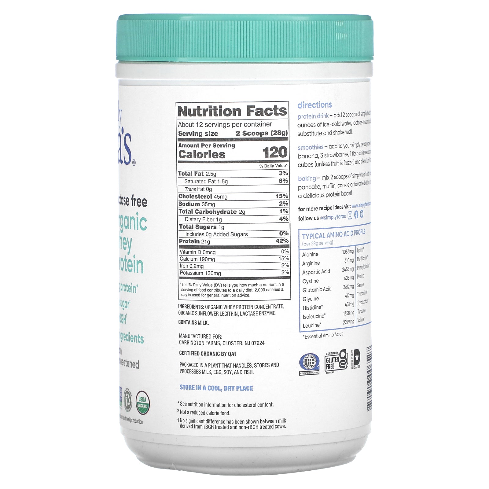 Protein drink - add 2 scoops of simply tera's to 6-8 ounces of ice-cold water, lactose-free milk, or milk substitute and shake well.