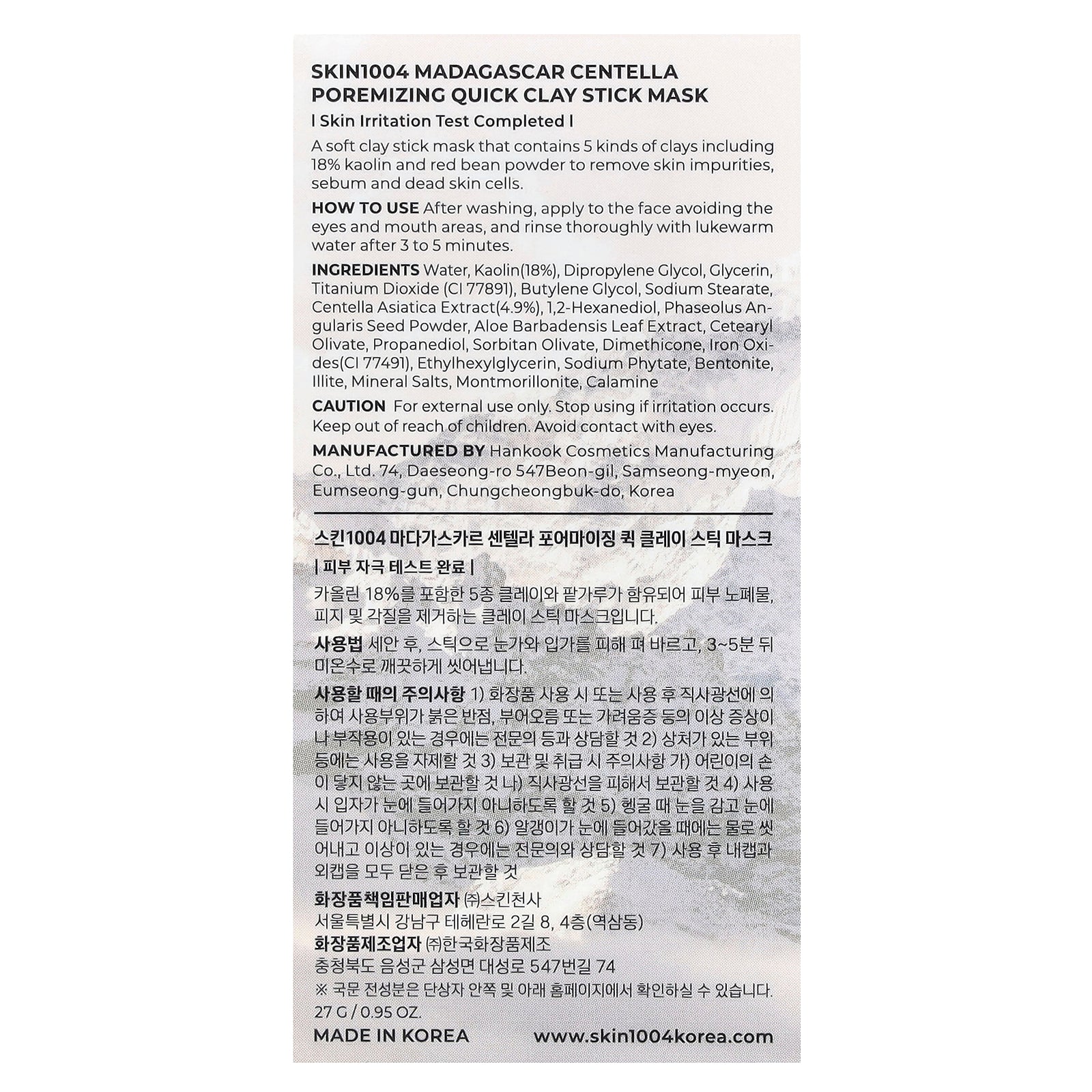 Water, kaolin(18%), dipropylene glycol, glycerin, titanium dioxide (ci 77891), butylene glycol, sodium stearate, centella asiatica extract(4.9%), 1,2-hexanediol, phaseolus angularis seed powder, aloe barbadensis leaf extract, cetearyl olivate, propanediol, sorbitan olivate, dimethicone, iron oxides(ci 77491), ethylhexylglycerin, sodium phytate, bentonite, illite, mineral salts, montmorillonite, calamine.