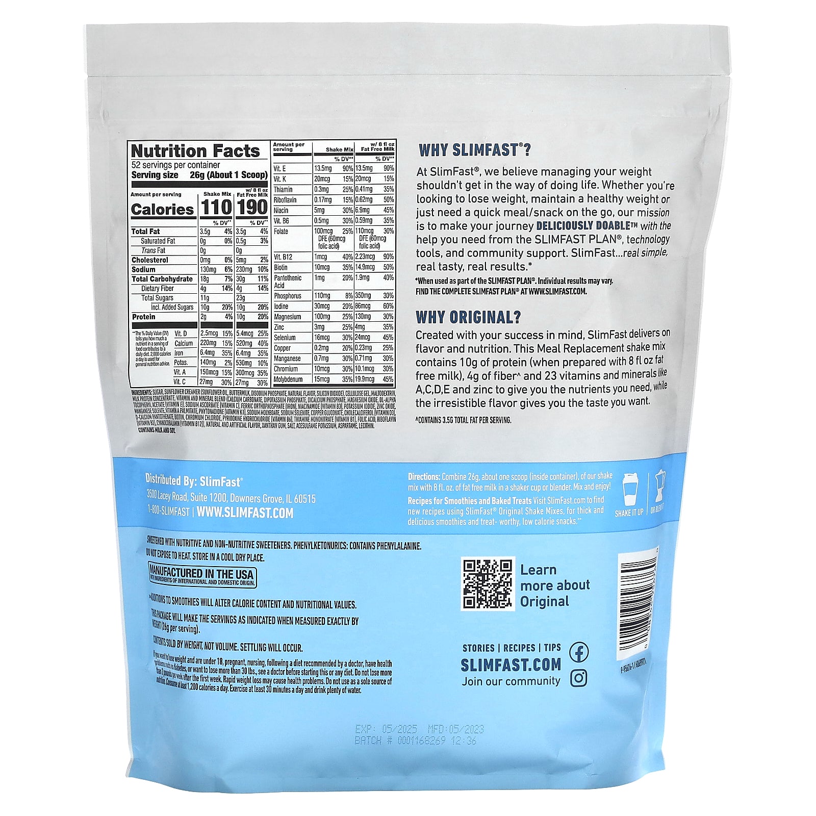 Created with your success in mind, SlimFast delivers on flavor and nutrition. This Meal Replacement shake mix contains 10g of protein (when prepared with 8 fl oz fat free milk), 4 g of fiber^ and 23 vitamins and minerals like A,C,D,E and zinc to give you the nutrients you need, while the irresistible flavor gives you the taste you want.