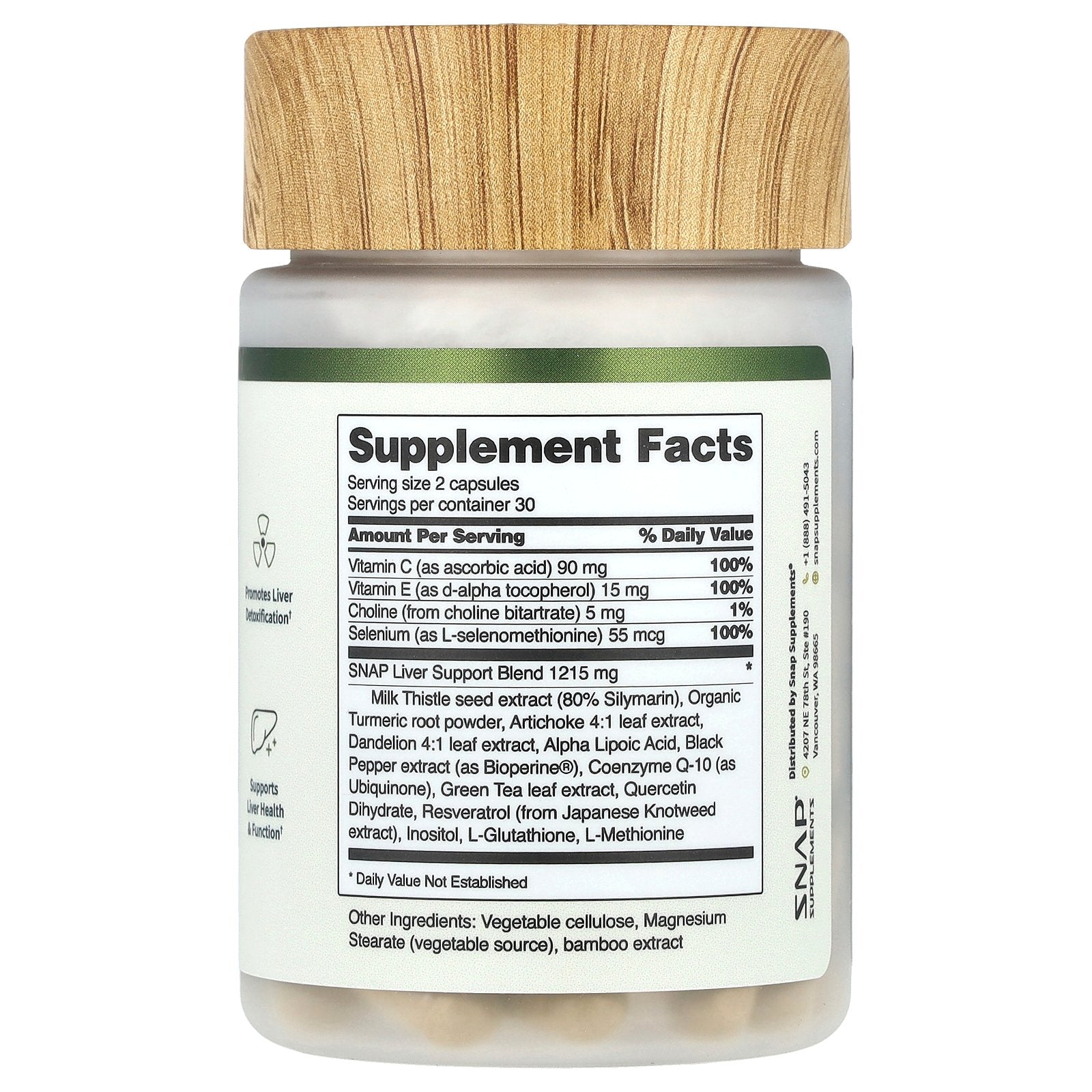 | SNAP Liver Support Blend Milk Thistle seed extract (80% Silymarin), Organic Turmeric root powder, Artichoke 4:1 leaf extract, Dandelion 4:1 leaf extract, Alpha Lipoic Acid, Black Pepper extract (as Bioperine®), Coenzyme Q-10 (as Ubiquinone), Green Tea leaf extract, Quercetin Dihydrate, Resveratrol (from Japanese Knotweed extract), Inositol, L-Glutathione, L-Methionine |
