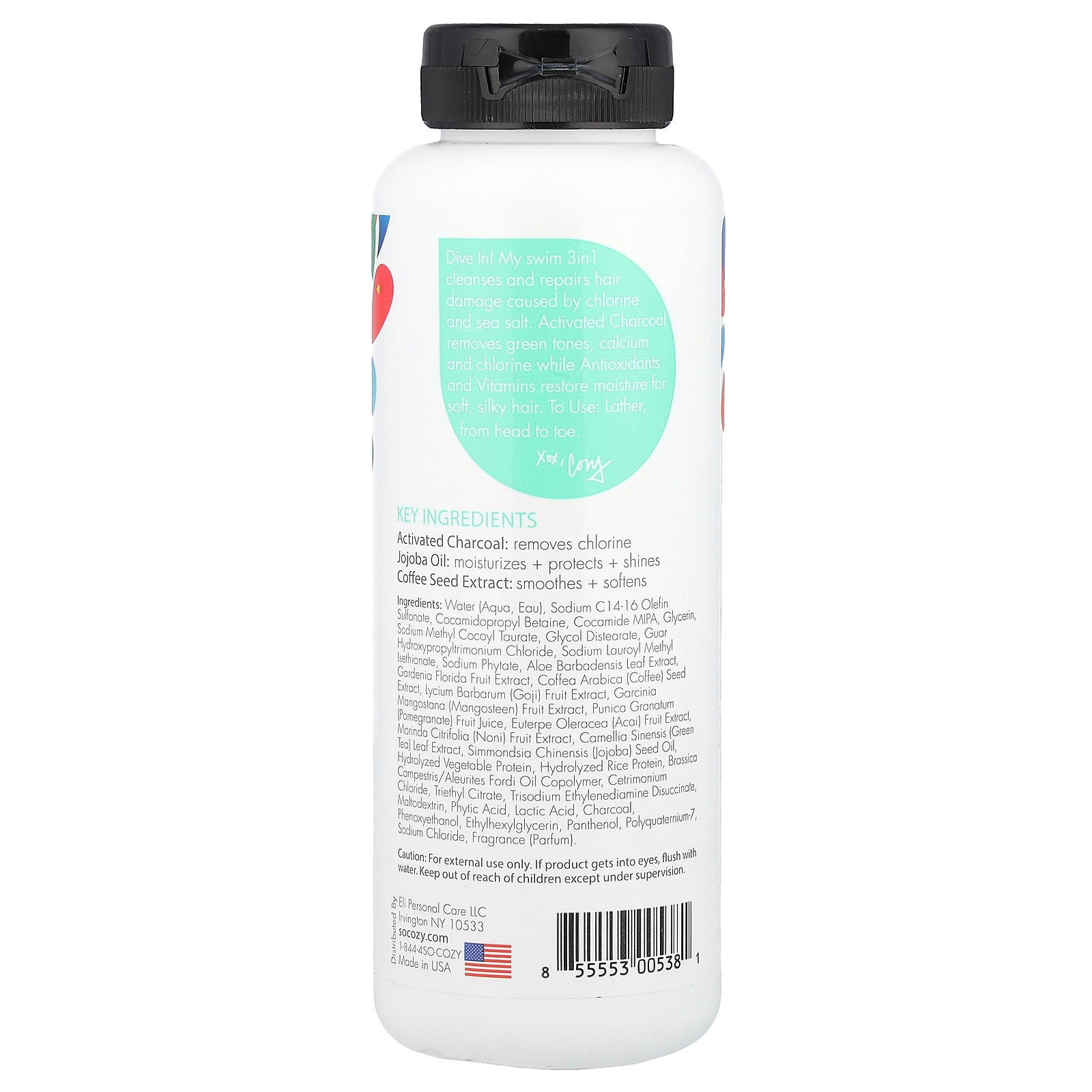Dive in! My swim 3 in 1 cleanses and repairs hair damage caused by chlorine and sea salt. Activated Charcoal removes green tones, calcium and chlorine while Antioxidants and Vitamins restore moisture for soft, silky hair.