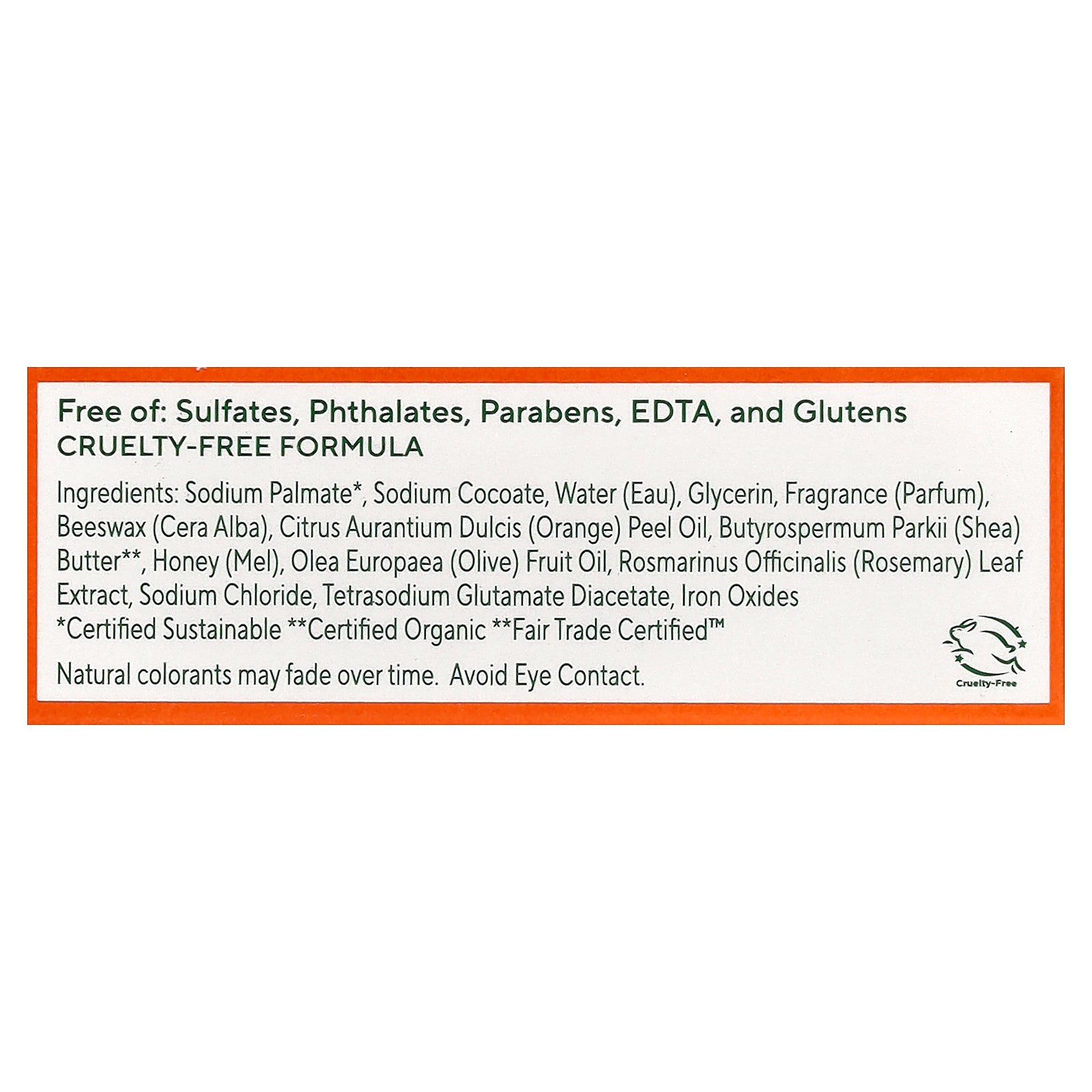 Sodium palmate*, sodium cocoate, water, glycerin, fragrance (parfum), beeswax (cera alba), citrus aurantium dulcis (orange) peel oil, butyrospermum parkii (shea) butter**, honey (mel), olea europaea (olive) fruit oil, rosmarinus officinalis (rosemary) leaf extract, sodium chloride, tetrasodium glutamate diacetate, iron oxides.