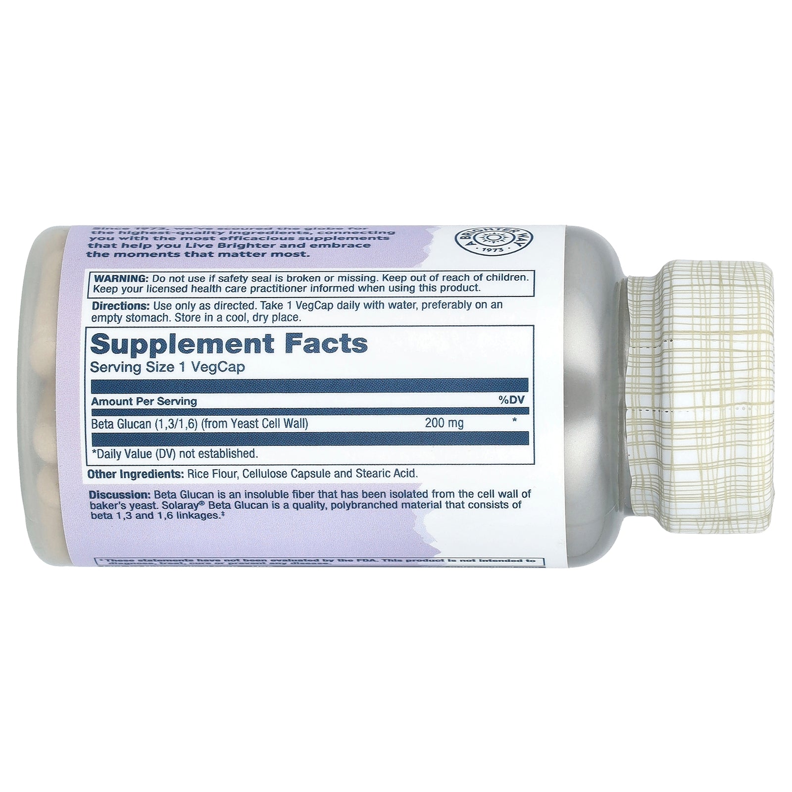 Discussion: Beta Glucan is an insoluble fiber that has been isolated from the cell wall of baker's yeast. Solaray® Beta Glucan is a quality, polybranched material that consists of beta 1,3 and 1,6 linkages.