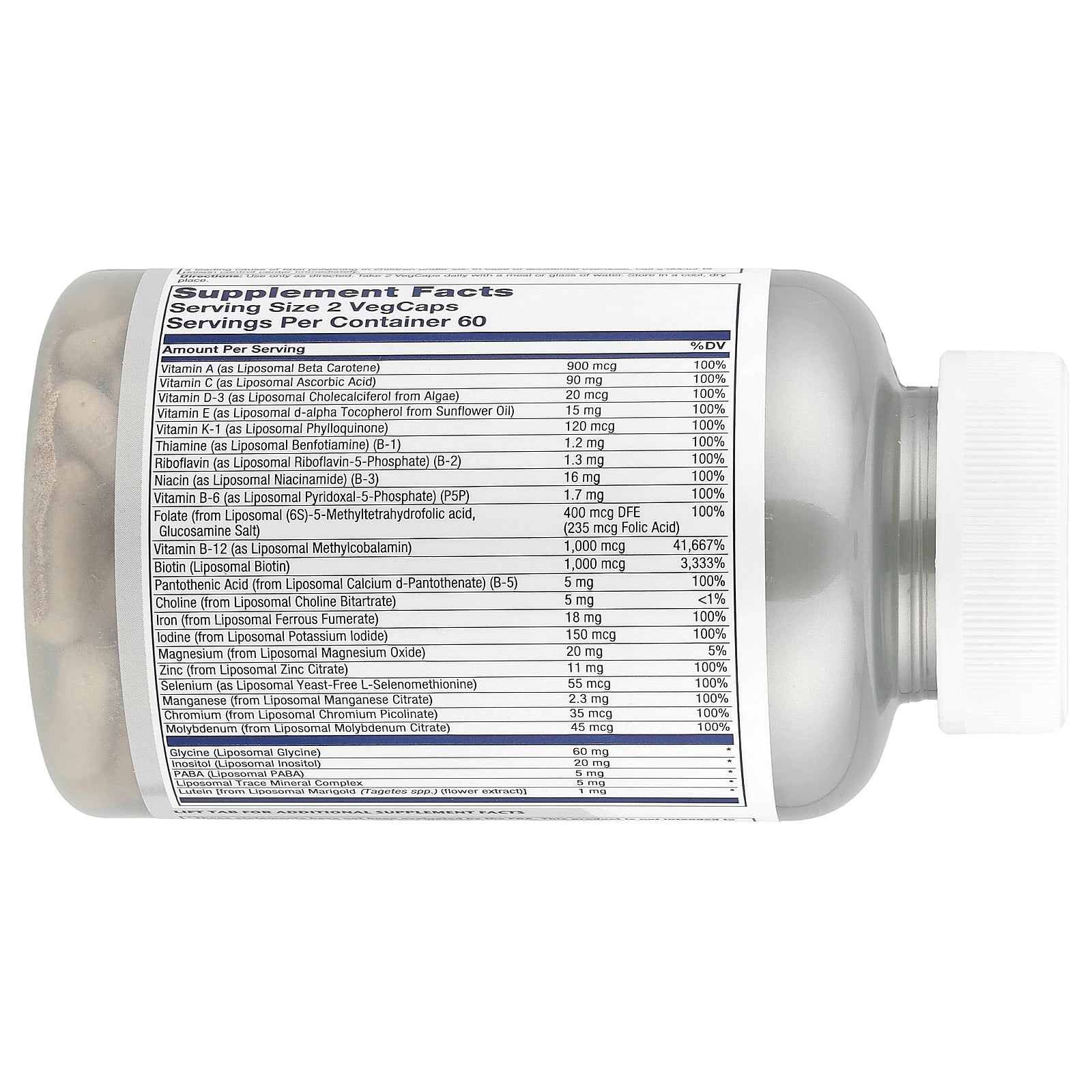 A high-potency blend of 37 liposomal nutrients—with 19 vitamins and minerals at 100% of the Daily Value or more.