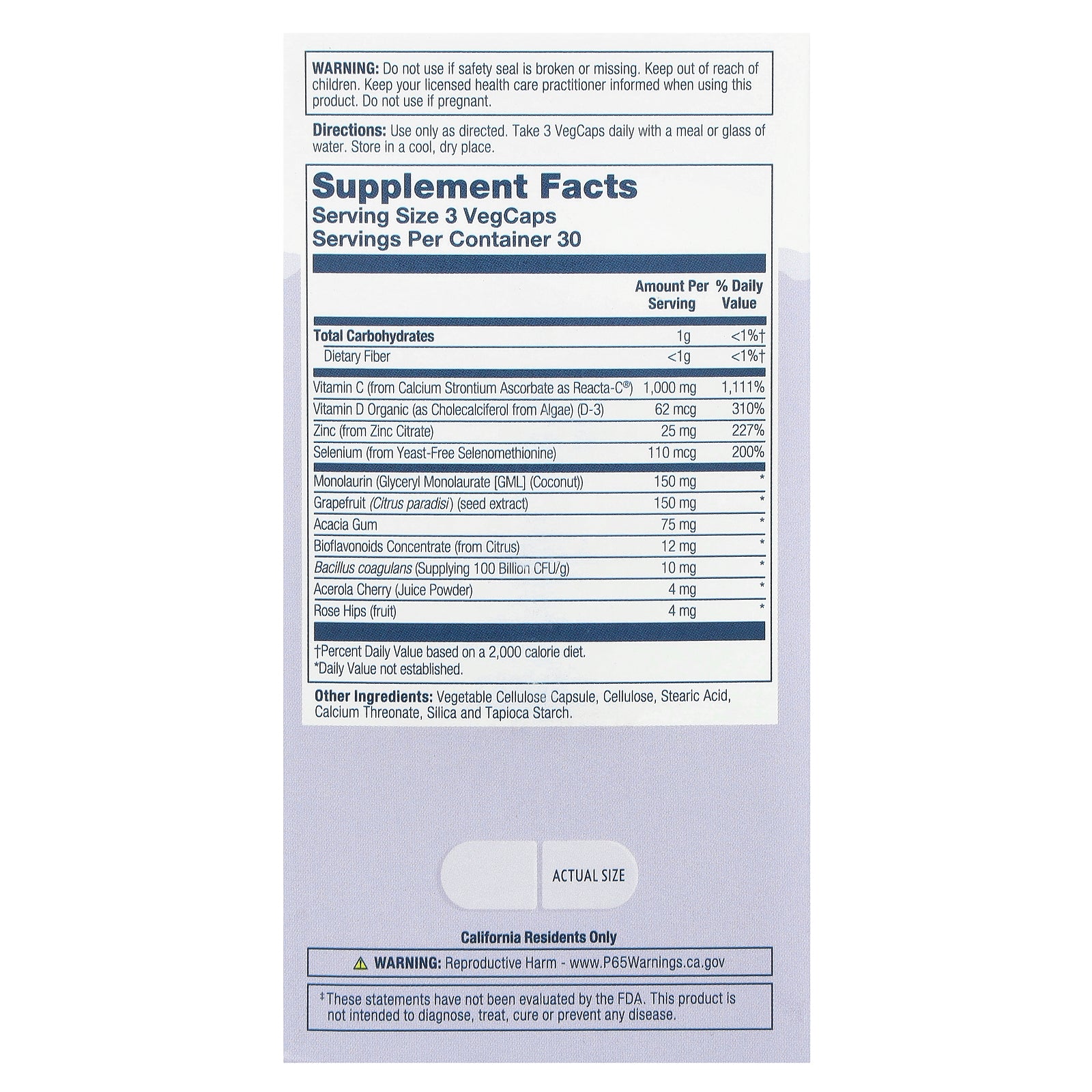 Use only as directed. Take 3 VegCaps daily with a meal or glass of water.