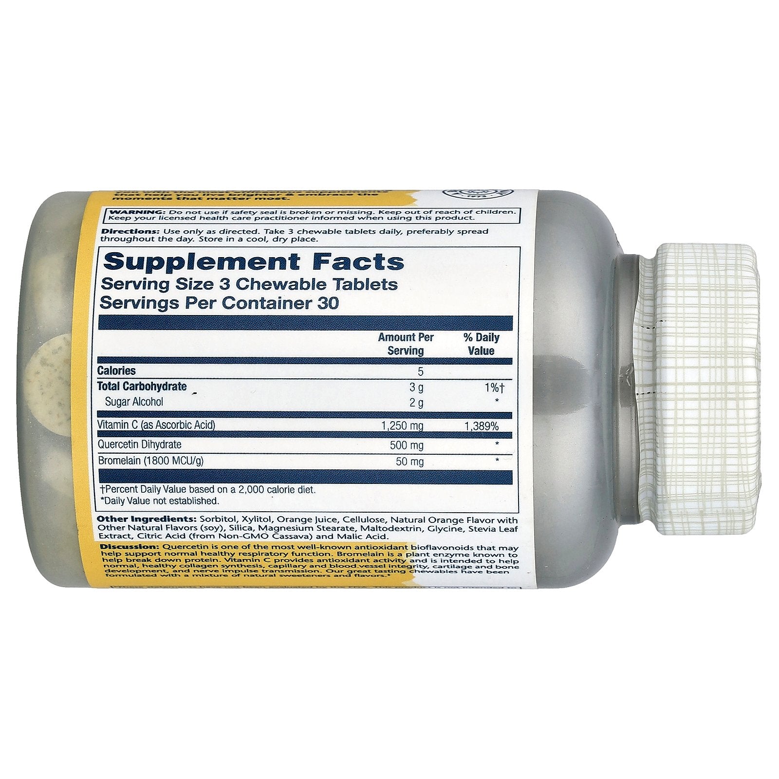Discussion: Quercetin is one of the most well-known antioxidant bioflavonoids that may help support normal healthy respiratory function. Bromelain is a plant enzyme known to help break down protein. Vitamin C provides antioxidant activity and is intended to help normal, healthy collagen synthesis, capillary and blood vessel integrity, cartilage and bone development, and nerve impulse transmission. Our great tasting chewables have been formulated with a mixture of natural sweeteners and flavors .