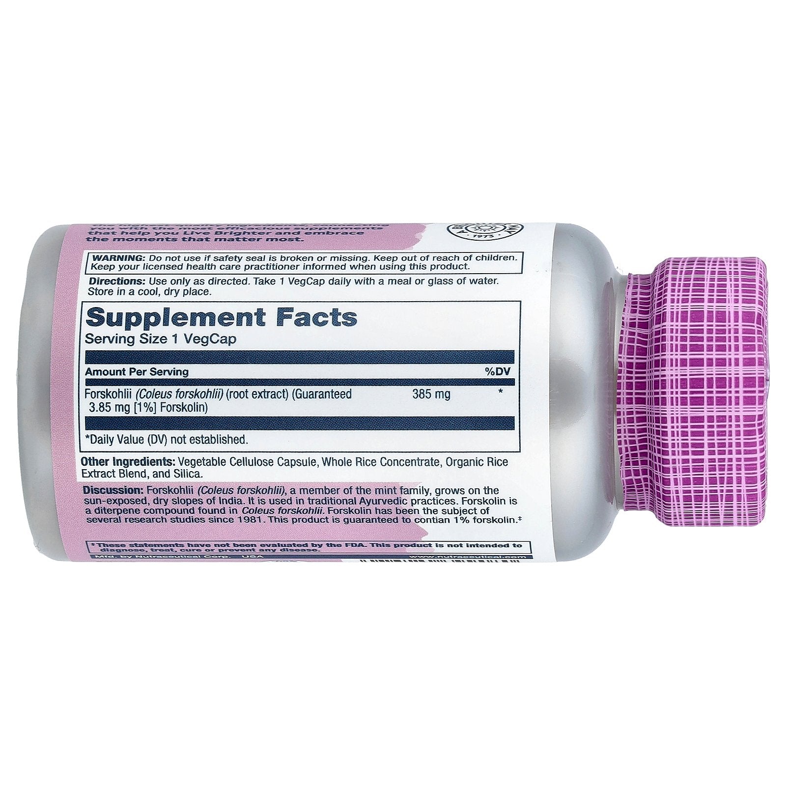 Discussion: Forskohlii (Coleus forskohlii), a member of the mint family, grows on the sun-exposed, dry slopes of India. It is used in traditional Ayurvedic practices. Forskolin is a diterpene compound found in Coleus forskohlii. Forskolin has been the subject of several research studies since 1981. This product is guaranteed to contain 1% forskolin.