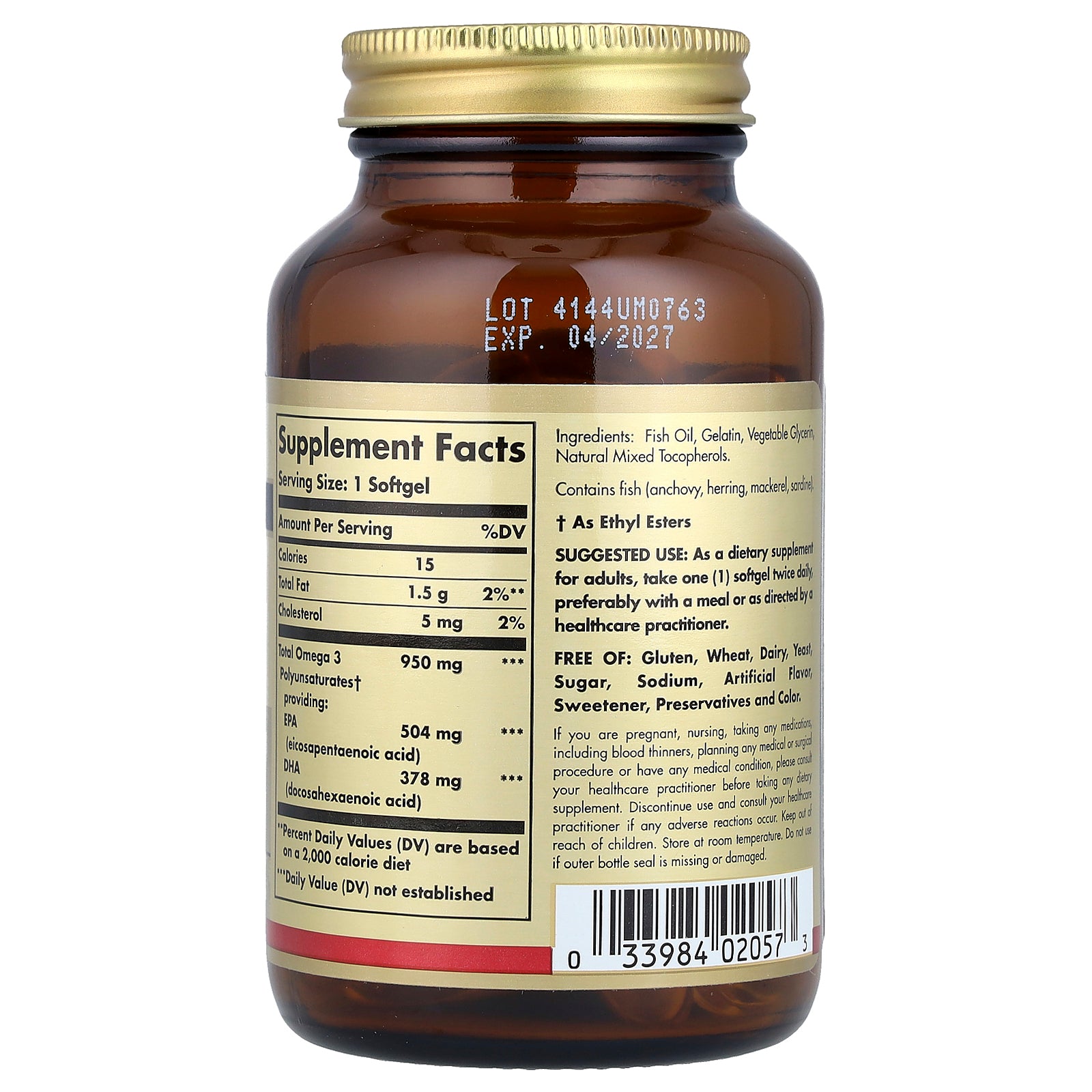 Omega 3 950 mg is Solgar's highest concentration of the natural Omega 3 polyunsaturates EPA and DHA from cold-water fish. This formulation supports cardiovascular, joint and skin health. It is molecularly distilled to remove mercury.