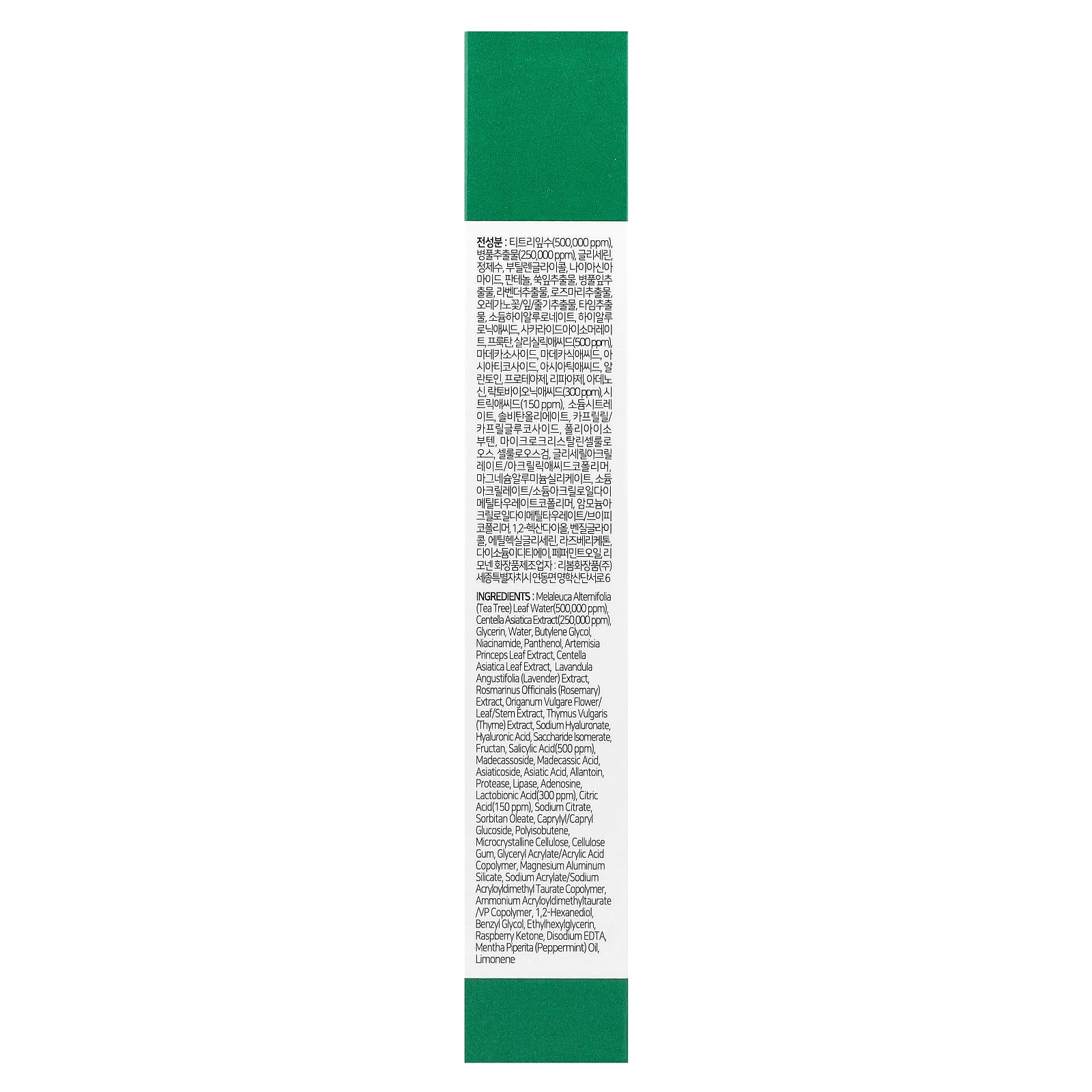 Melaleuca alternifolia (tea tree) leaf water(500,000 ppm), centella asiatica extract(250,000 ppm), glycerin, water, butylene glycol, niacinamide, panthenol, artemisia princeps leaf extract, centella asiatica leaf extract, lavandula angustifolia (lavender) extract, rosmarinus officinalis (rosemary) extract, origanum vulgare flower/ leaf/stem extract, thymus vulgaris (thyme) extract, sodium hyaluronate, hyaluronic acid, saccharide isomerate, fructan, salicylic acid(500 ppm), madecassoside, madecassic acid, asiaticoside, asiatic acid, allantoin, protease, lipase, adenosine, lactobionic acid(300 ppm), citric acid(150 ppm), sodium citrate, sorbitan oleate, caprylyl/capryl glucoside, polyisobutene, microcrystalline cellulose, cellulose gum, glyceryl acrylate/acrylic acid copolymer, magnesium aluminum silicate, sodium acrylate/sodium acryloyldimethyl taurate copolymer, ammonium acryloyldimethyltaurate /vp copolymer, 1,2-hexanediol, benzyl glycol, ethylhexylglycerin, raspberry ketone, disodium edta, mentha piperita (peppermint) oil, limonene.