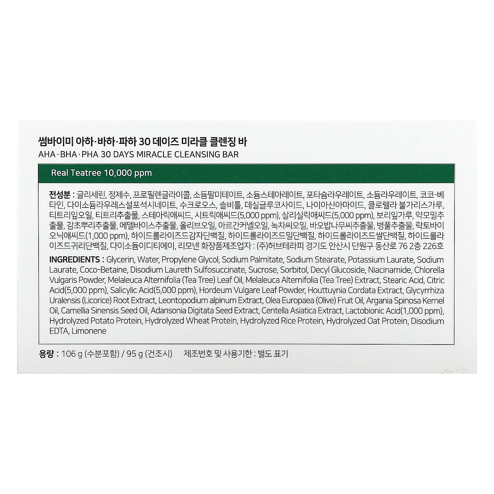 Glycerin, water, propylene glycol, sodium palmitate, sodium stearate, potassium laurate, sodium laurate, coco-betaine, disodium laureth sulfosuccinate, sucrose, sorbitol, decyl glucoside, niacinamide, chlorella vulgaris powder, melaleuca alternifolia (tea tree) leaf oil, melaleuca alternifolia (tea tree) extract, stearic acid, citric acid (5,000 ppm), salicylic acid (5,000 ppm), hordeum vulgare leaf powder, houttuynia cordata extract, glycyrrhiza uralensis (licorice) root extract, leontopodium alpinum extract, olea europaea (olive) fruit oil, argania spinosa kernel oil, camellia sinensis seed oil, adansonia digitata seed extract, centella asiatica extract, lactobionic acid (1,000 ppm), hydrolyzed potato protein, hydrolyzed wheat protein, hydrolyzed rice protein, hydrolyzed oat protein, disodium edta, limonene.