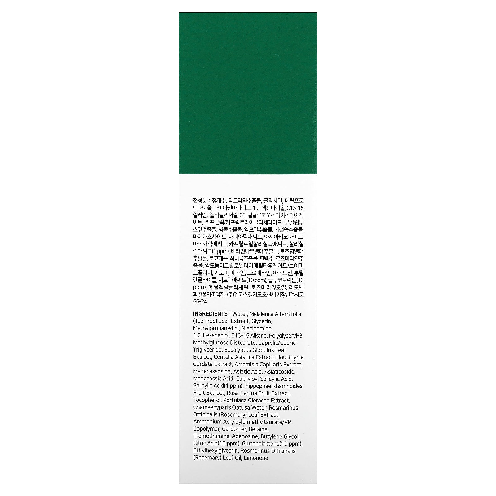 Water, melaleuca alternifolia (tea tree) leaf extract, glycerin, methylpropanediol, niacinamide, 1,2-hexanediol, c13-15 alkane, polyglyceryl-3 methylglucose distearate, caprylic/capric triglyceride, eucalyptus globulus leaf extract, centella asiatica extract, houttuynia cordata extract, artemisia capillaris extract, madecassoside, asiatic acid, asiaticoside, madecassic acid, capryloyl salicylic acid, salicylic acid(1 ppm), hippophae rhamnoides fruit extract, rosa canina fruit extract, tocopherol, portulaca oleracea extract, chamaecyparis obtusa water, rosmarinus officinalis (rosemary) leaf extract, ammonium acryloyldimethyltaurate/vp copolymer, carbomer, betaine, tromethamine, adenosine, butylene glycol, citric acid (10 ppm), gluconolactone (10 ppm), ethylhexylglycerin, rosmarinus officinalis (rosemary) leaf oil, limonene.