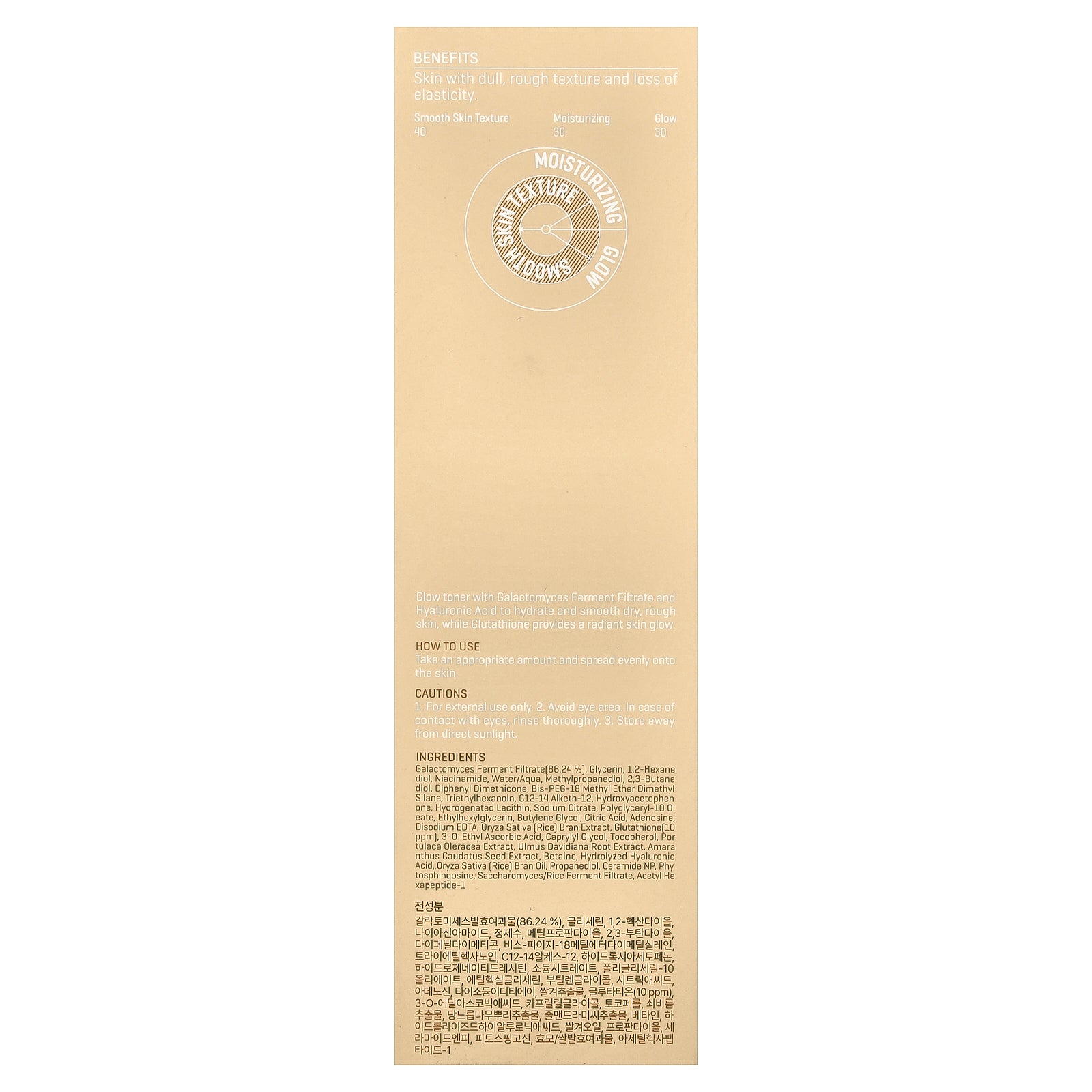 Glow toner with Galactomyces Ferment Filtrate and Hyaluronic Acid to hydrate and smooth dry, rough skin, while Glutathione provides a radiant skin glow.