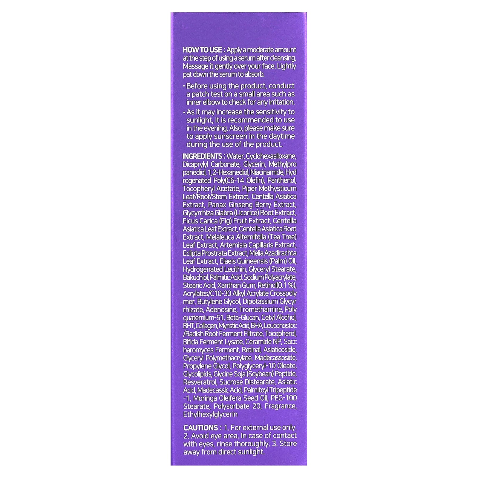 Water, cyclohexasiloxane, dicaprylyl carbonate, glycerin, methylpropanediol, 1,2-hexanediol, niacinamide, hydrogenated poly(c6-14 olefin), panthenol, tocopheryl acetate, piper methysticum leaf/root/stem extract, centella asiatica extract, panax ginseng berry extract, glycyrrhiza glabra (licorice) root extract, ficus carica (fig) fruit extract, centella asiatica leaf extract, centella asiatica root extract, melaleuca alternifolia (tea tree) leaf extract, artemisia capillaris extract, eclipta prostrata extract, melia azadirachta leaf extract, elaeis guineensis (palm) oil, hydrogenated lecithin, glyceryl stearate, bakuchiol, palmitic acid, sodium polyacrylate, stearic acid, xanthan gum, retinol(0.1 %), acrylates/c10-30 alkyl acrylate crosspolymer, butylene glycol, dipotassium glycyrrhizate, adenosine, tromethamine, poly quaternium-51, beta-glucan, cetyl alcohol, bht, collagen, myristic acid, bha, leuconostoc /radish root ferment filtrate, tocopherol, bifida ferment lysate, ceramide np, saccharomyces ferment, retinal, asiaticoside, glyceryl polymethacrylate, madecassoside, propylene glycol, polyglyceryl-10 oleate, glycolipids, glycine soja (soybean) peptide, resveratrol, sucrose distearate, asiatic acid, madecassic acid, palmitoyl tripeptide -1, moringa oleifera seed oil, peg-100 stearate, polysorbate 20, fragrance, ethylhexylglycerin.
