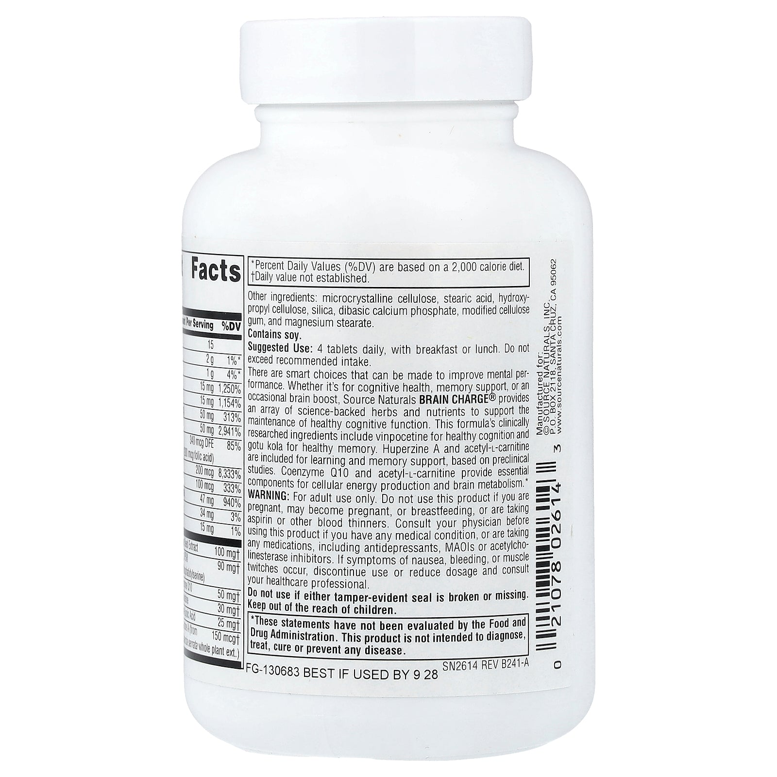 There are smart choices that can be made to improve mental performance. Whether it’s for cognitive health, memory support, or an occasional brain boost, Source Naturals Brain Charge® provides an array of science-backed herbs and nutrients to support the maintenance of healthy cognitive function. This formula’s clinically researched ingredients include vinpocetine for healthy cognition and gotu kola for healthy memory. Huperzine A and acetyl-L-carnitine are included for learning and memory support, based on preclinical studies. Coenzyme Q10 and acetyl-L-carnitine provide essential components for cellular energy production and brain metabolism.