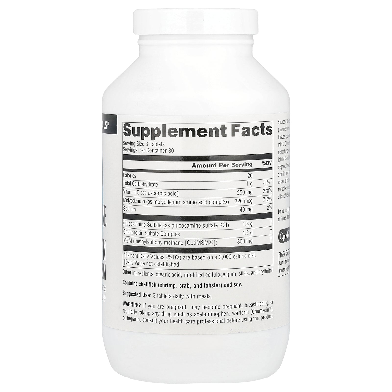 Source Naturals Glucosamine Chondroitin Complex With MSM provides four important building blocks for healthy joints and connective tissues: glucosamine, chondroitin, bioavailable sulfur (MSM), and vita- min C. Glucosamine, an amino sugar, is an essential structural component of glycosaminoglycans, large linear molecules that help to lubricate joints. Chondroitin sulfate lends additional structural support via its high degree of interaction of collagen fibers. Bioavailable sulfur (MSM) plays a critical role in the integrity of joints and connective tissues. Vitamin C, essential for the production of collagen, also serves as an effective free radical scavenger to protect cells. Molybdenum aids in complete metabolism of MSM, glucosamine, and chondroitin.