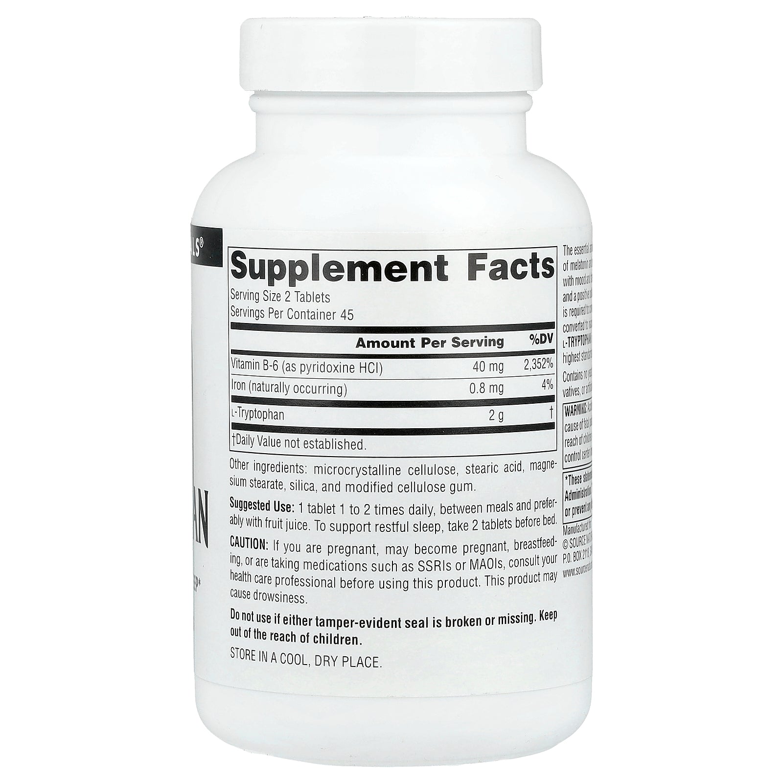 The essential amino acid L-tryptophan is the precursor for the synthesis of melatonin and serotonin, a hormone and a neurotransmitter involved with mood and stress response. It helps support relaxation, restful sleep, and a positive outlook. This tryptophan tablet includes vitamin B-6, which is required to convert tryptophan to serotonin. If needed, L-tryptophan is converted to niacin in the body, an important B vitamin. Source Naturals L-Tryptophan is extremely pure and is regularly tested to ensure the highest standards of quality.