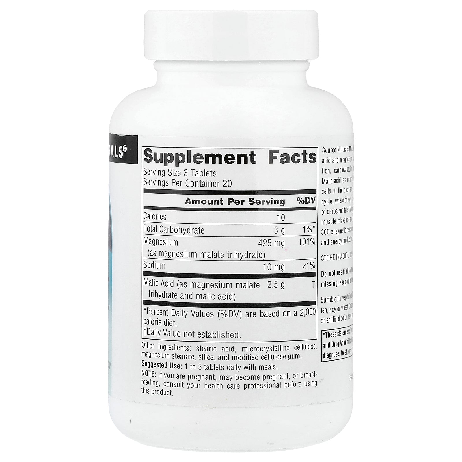 Source Naturals MALIC ACID is a combination of malic acid and magnesium. It supports proper muscle function, cardiovascular health, and energy production. Malic acid is a natural fruit acid present in most cells in the body and is an intermediate in the Krebs cycle, where energy is captured during the metabolism of carbohydrates and fats. Magnesium plays an important role in muscle relaxation and is an essential cofactor for over 300 enzymatic reactions in metabolism, ATP synthesis, and energy production.