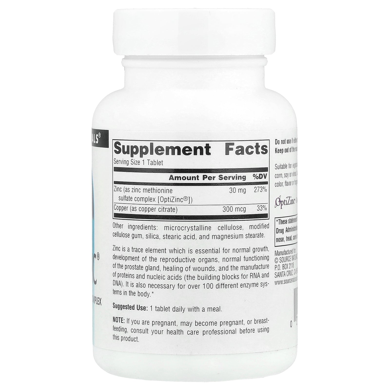 | Zinc (as zinc methionine sulfate complex [OptiZinc®]) | 30 mg | 273% |