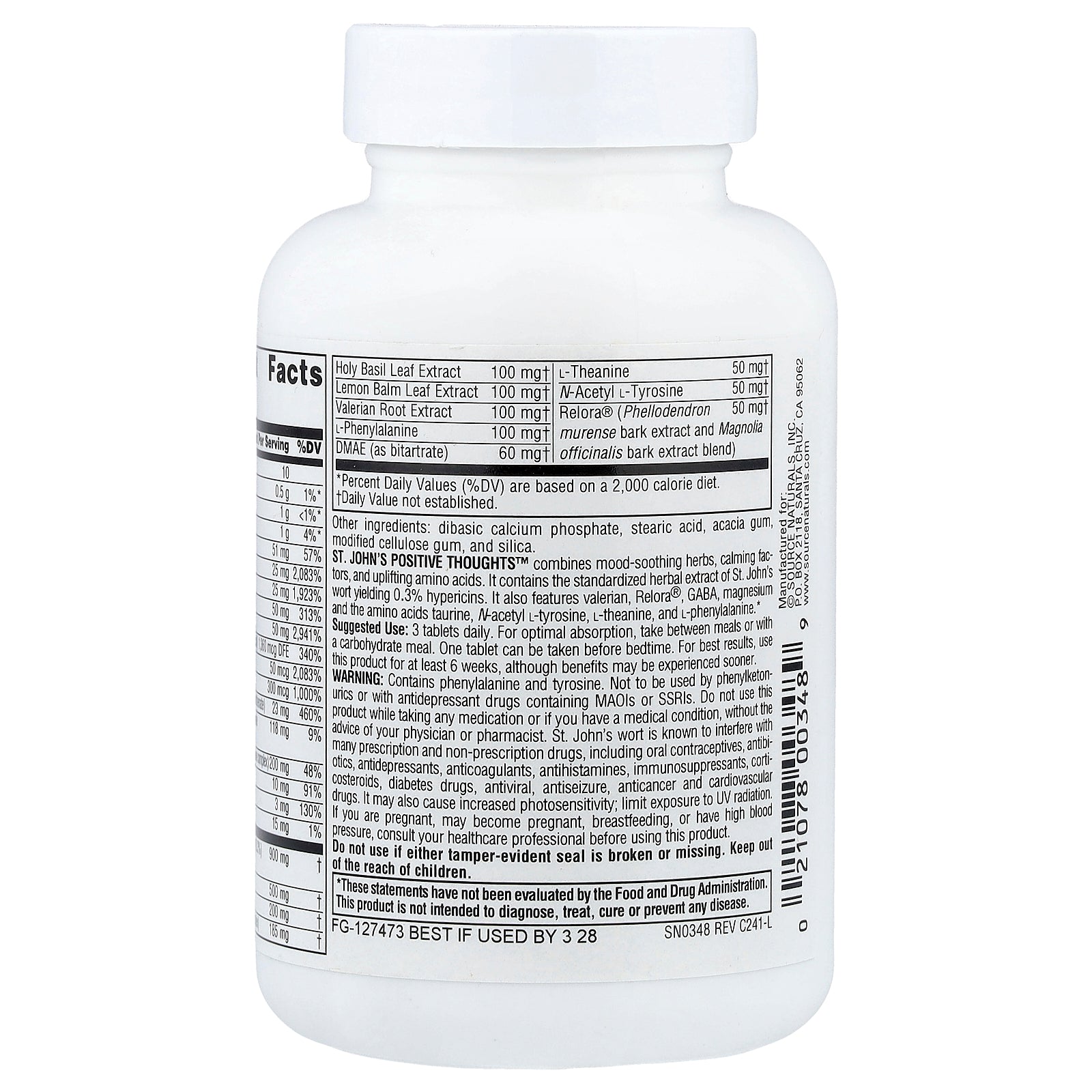 St. John's Positive Thoughts™ combines mood-soothing herbs, calming factors, and uplifting amino acids. It contains standardized herbal extracts of St. John's wort yielding 0.3% hypericins. It also features Relora®, GABA, magnesium and the amino acids taurine, N-acetyl, L-tyrosine, L-theanine, and L-phenylalanine.