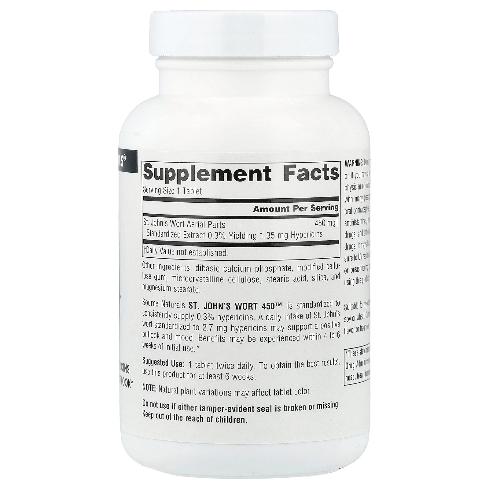 Source Naturals St. John's Wort 450™ is standardized to consistently supply 0.3% hypericin. A daily intake of St. John's wort standardized to 2.7 mg hypericin may support a positive outlook and mood. Benefits may be experienced within 4 to 6 weeks of initial use.