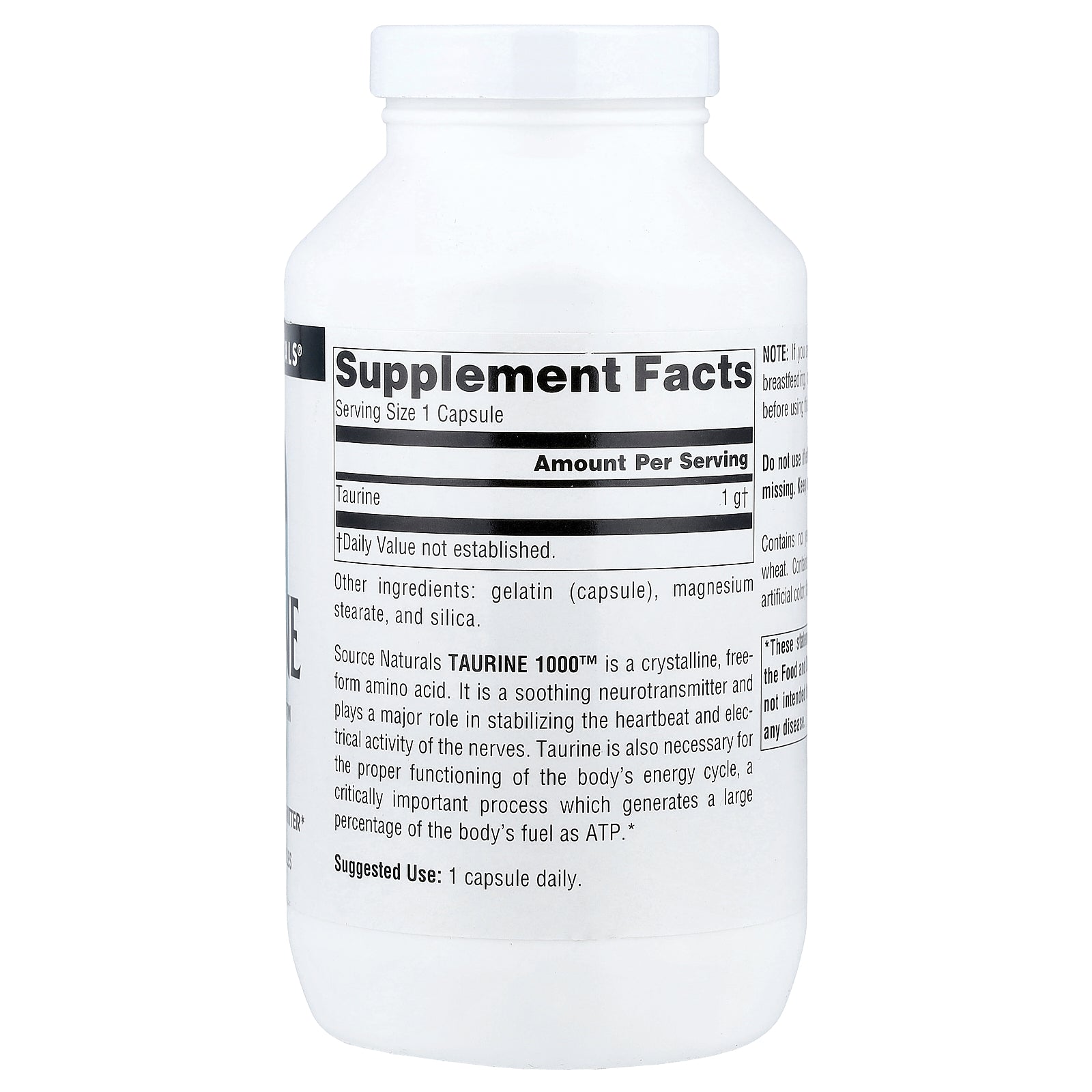 Source Natural Taurine 1000™ is a crystalline, free-form amino acid. It is a soothing neurotransmitter and plays a major role in stabilizing the heartbeat and electrical activity of the nerves. Taurine is also necessary for the proper functioning of the body's energy cycle, a critically important process which generates a large percentage of the body's fuel as ATP.