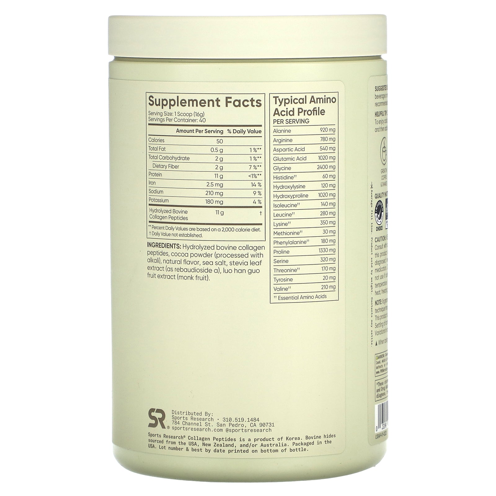 Hydrolyzed bovine collagen peptides, cocoa powder (processed with alkali), natural flavor, sea salt, stevia leaf extract (as rebaudioside a), luo han guo fruit extract (monk fruit).