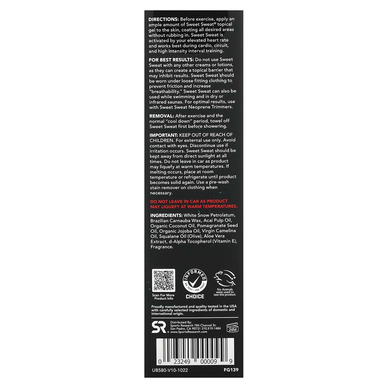 For best results: Do not use Sweet Sweat with any other creams or lotions, as they can create a topical barrier that may inhibit results. Sweet Sweat should be worn under loose fitting clothing to prevent friction and increase "breathability." Sweet Sweat can also be used while swimming and in dry or infrared saunas. For optimal results, use with Sweet Sweat Neoprene Trimmers.