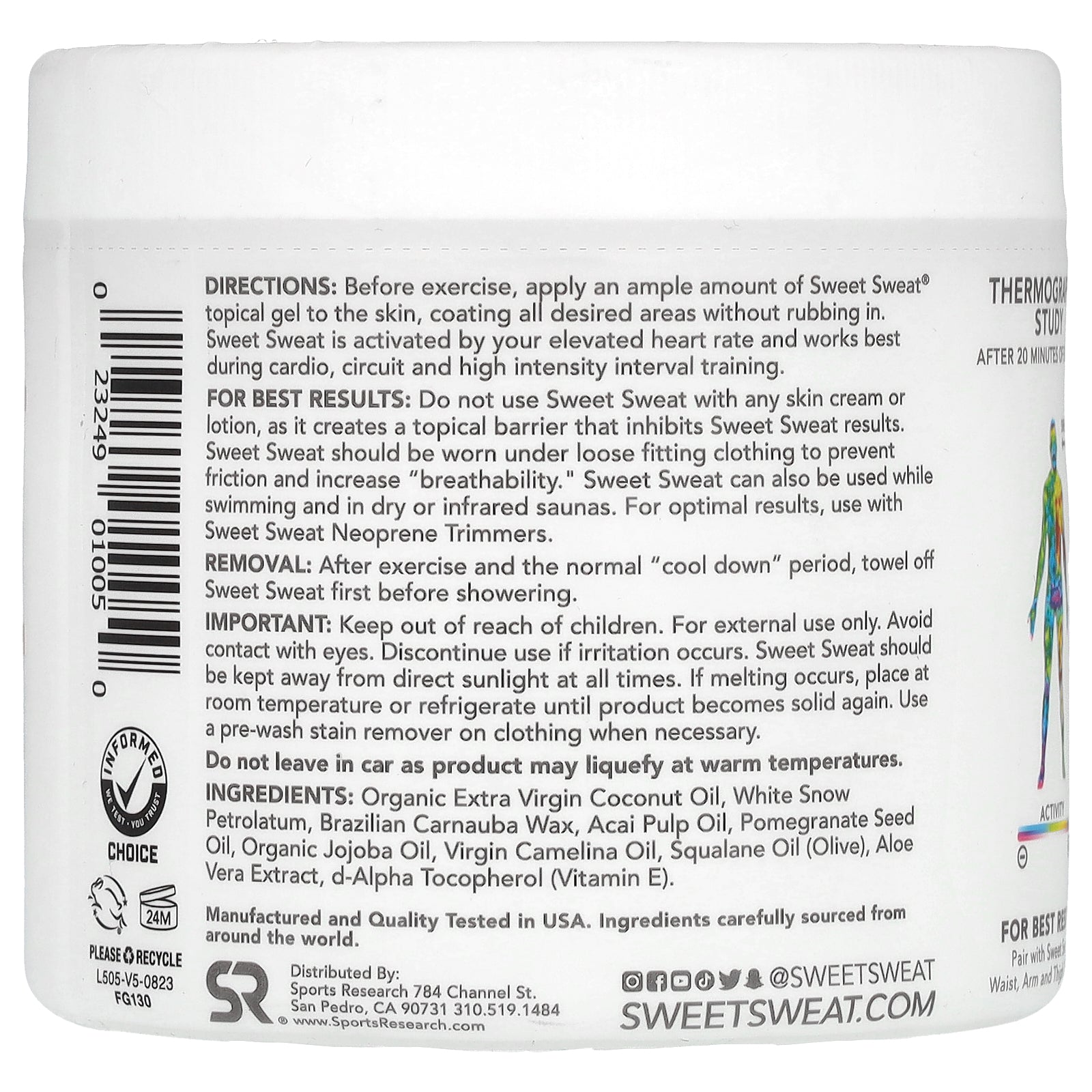 For Best Results: Do not use Sweet Sweat with any skin cream or lotion, as it creates a topical barrier that inhibits Sweet Sweat results. Sweet Sweat should be worn under loose fitting clothing to prevent friction and increase "breathability." Sweet Sweat can also be used while swimming and in dry or infrared saunas. For optimal results, use with Sweet Sweat Neoprene Trimmers.
