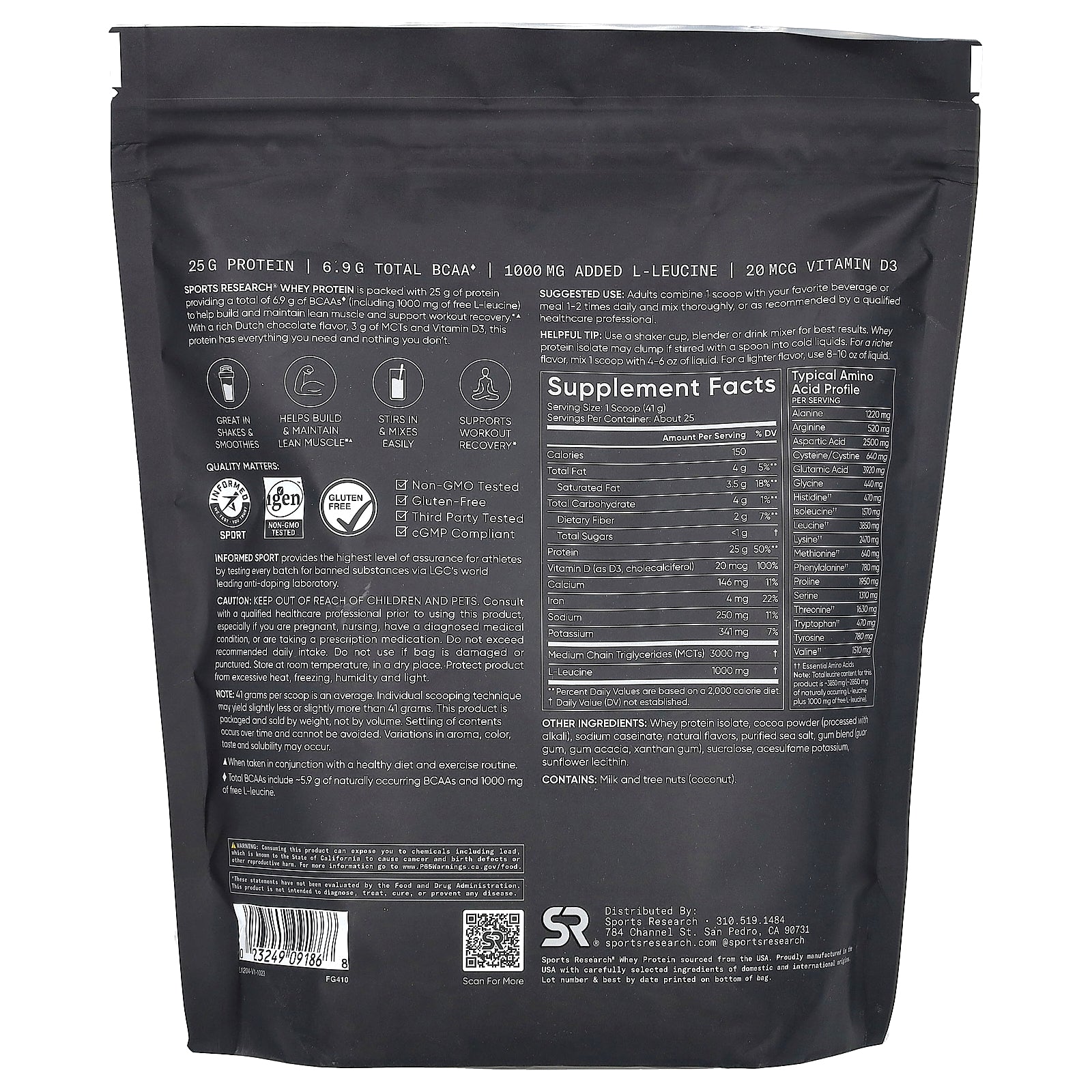 Sports Research® Whey Protein is packed with 25 g of protein providing a total of 6.9 g of BCAAs♦ (including 1000 mg of free L-leucine) to help build and maintain lean muscle and support workout recovery.^ With a rich vanilla flavor, 3 g of MCTs and Vitamin D3, this protein has everything you need and nothing you don't.
