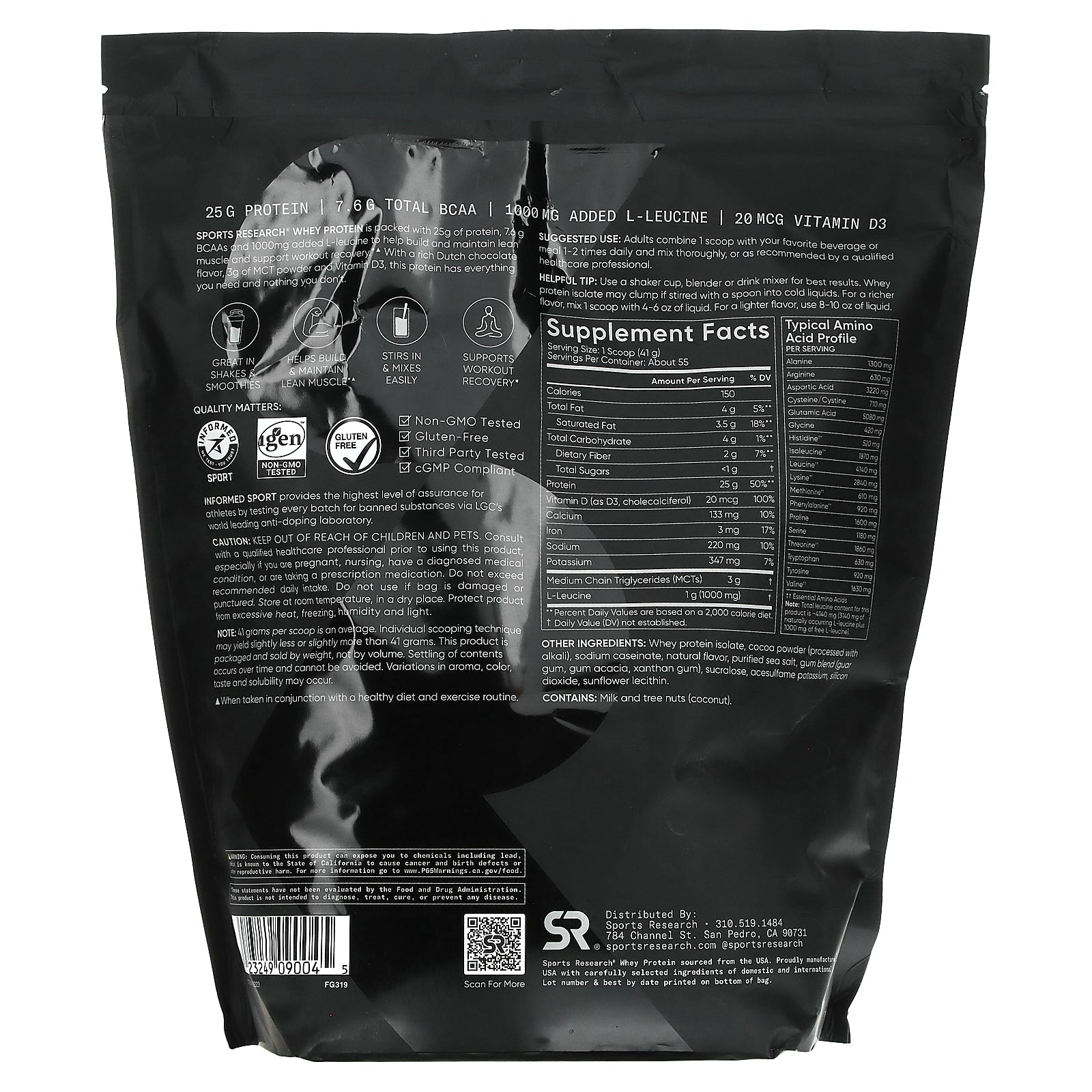 Sports Research® Whey Protein is packed with 25 g of protein, 7.6 g BCAAs and 1,000 mg added L-leucine to help build and maintain lean muscle and support workout recover.*^ With a rich Dutch chocolate flavor, 3 g of MCT powder and Vitamin D3, this protein has everything you need and nothing you don't.
