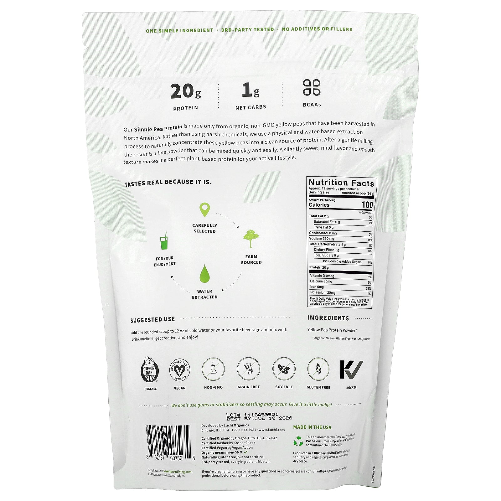 Our Simple Pea Protein is made only from organic, non-GMO yellow peas that have been harvested in North America. Rather than using harsh chemicals, we use a physical and water-based extraction process to naturally concentrate these yellow peas into a clean source of protein. After a gentle milling, the result is a fine powder that can be mixed quickly and easily. A slightly sweet, mild flavor and smooth texture makes it a perfect plant-based protein for your active lifestyle.