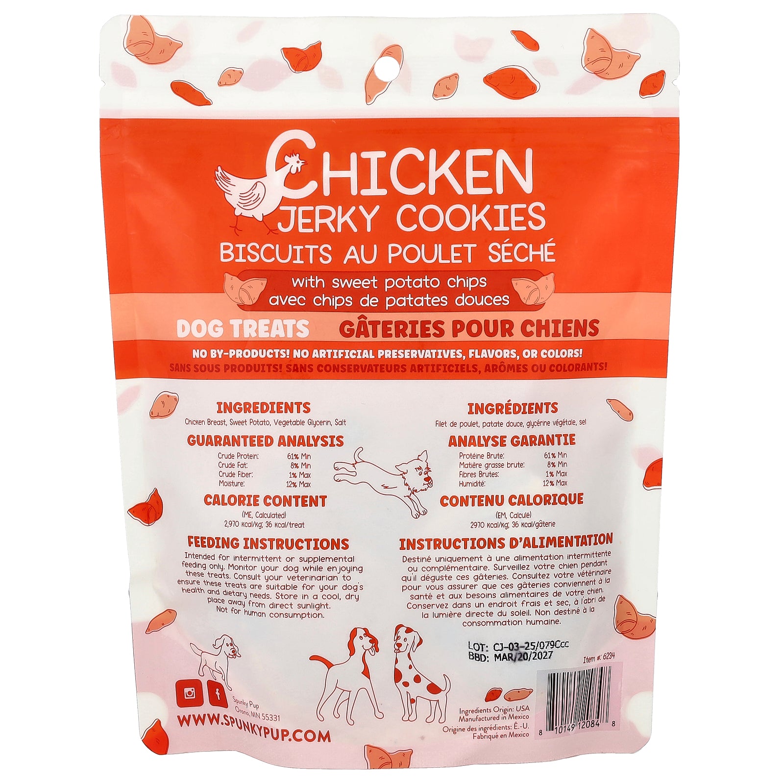 Introducing Spunky Pup's Chicken Jerky Cookies with Sweet Potato Chips—the ultimate tail-wagging treat for your canine companion! These cookies aren't just treats; they're a flavor-packed adventure shaped like cookies, complete with savory sweet potato chips for extra yum. Crafted with care, each cookie starts with premium, USA-sourced chicken as the star ingredient.