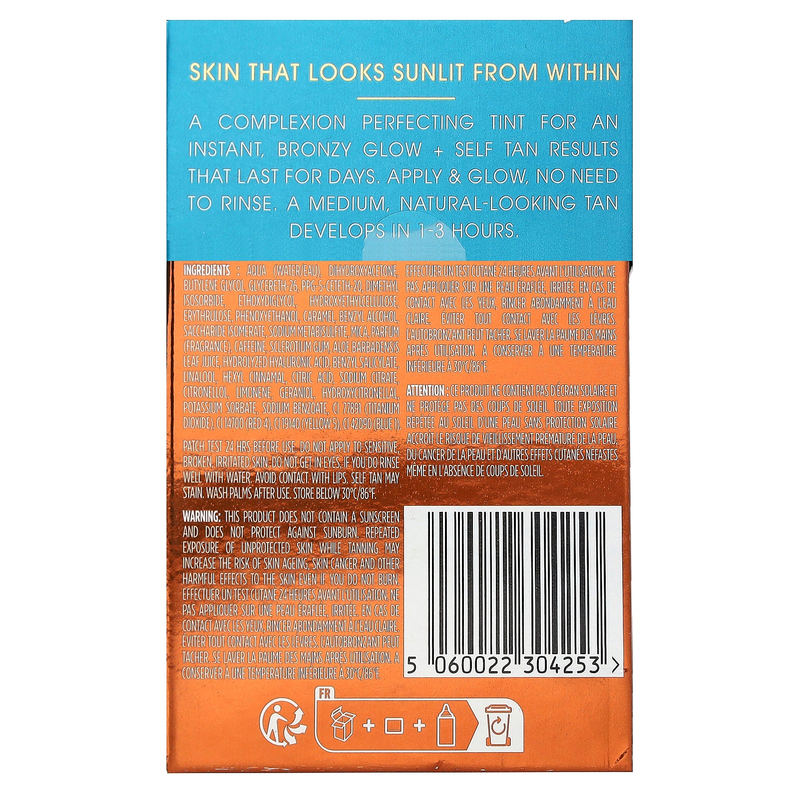 A complexion perfecting tint for an instant, bronzy glow + self tan results that last for days. Apply & glow, no need to rinse. A medium, natural-looking tan develops in 1-3 hours.