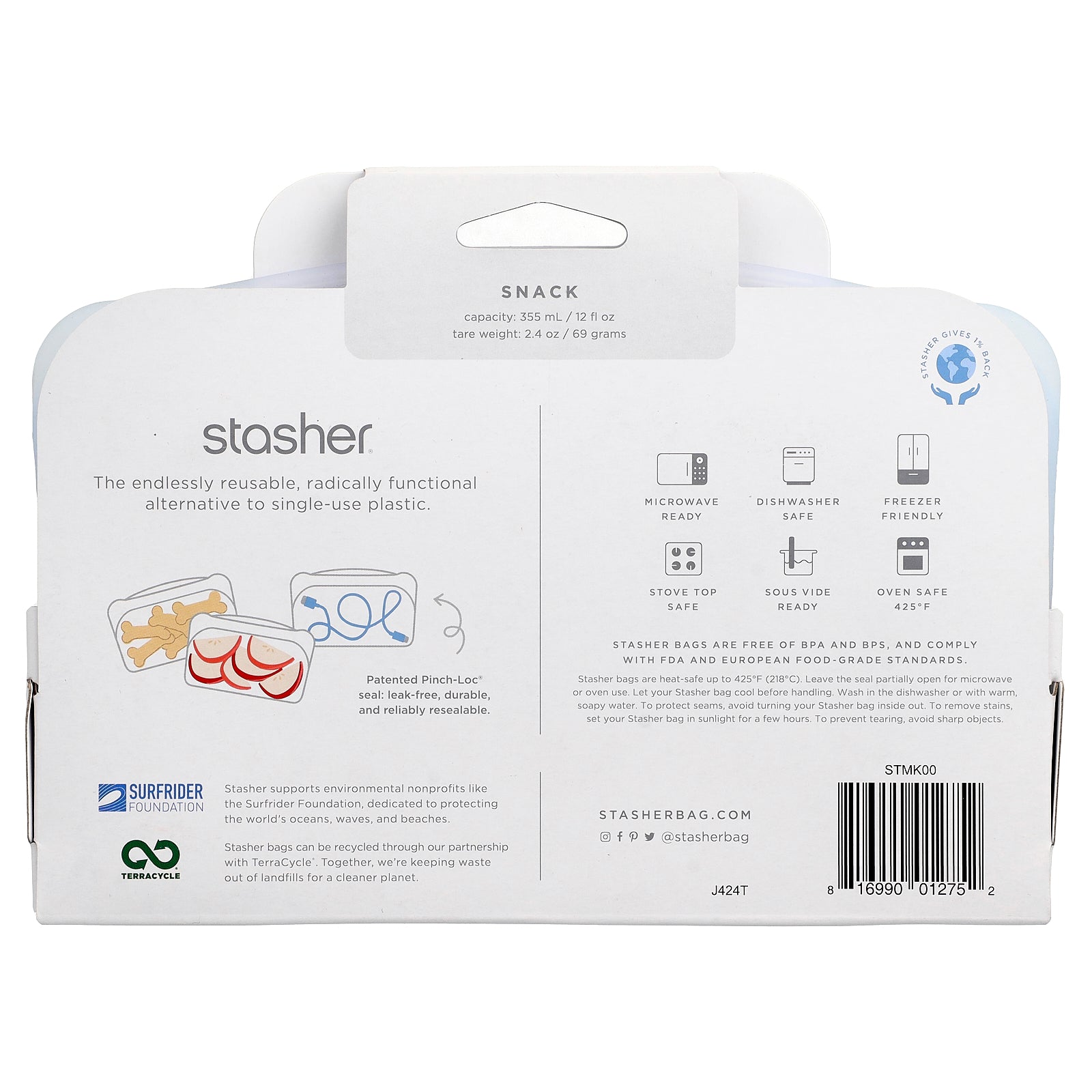 Stasher bags are heat-safe up to 425°F (218°C). Leave the seal partially open for microwave or oven use. Let your Stasher bag cool before handling. Wash in the dishwasher or with warm, soapy water. To protect seams, avoid turning your Stasher inside out. To remove stains, set your Stasher in sunlight for a few hours. To prevent tearing, avoid sharp objects.