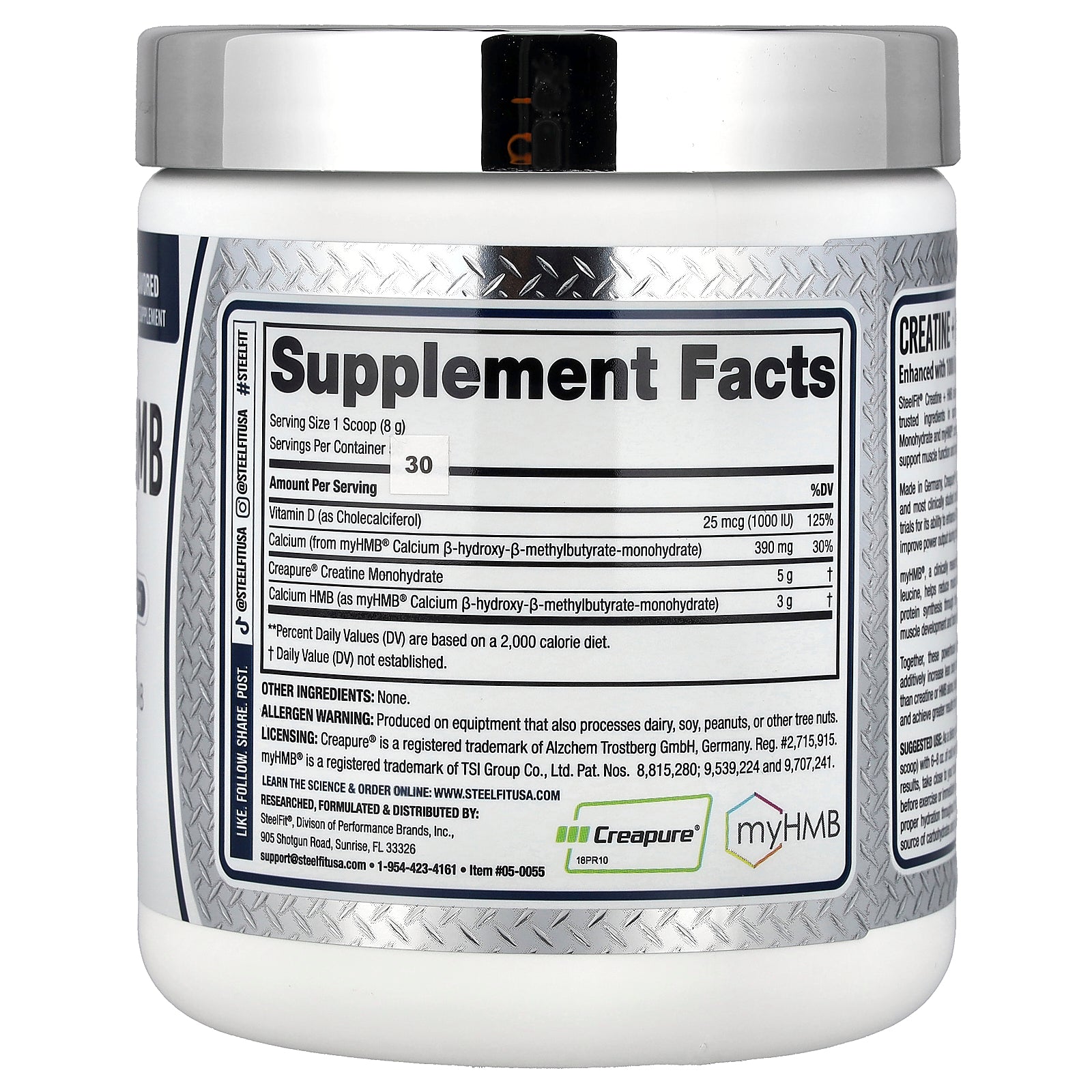 SteelFit® Creatine + HMB delivers two of the most proven and trusted ingredients in sports nutrition: Creapure® Creatine Monohydrate and myHMB®, combined with 1,000 IU of Vitamin D to support muscle function and strength.