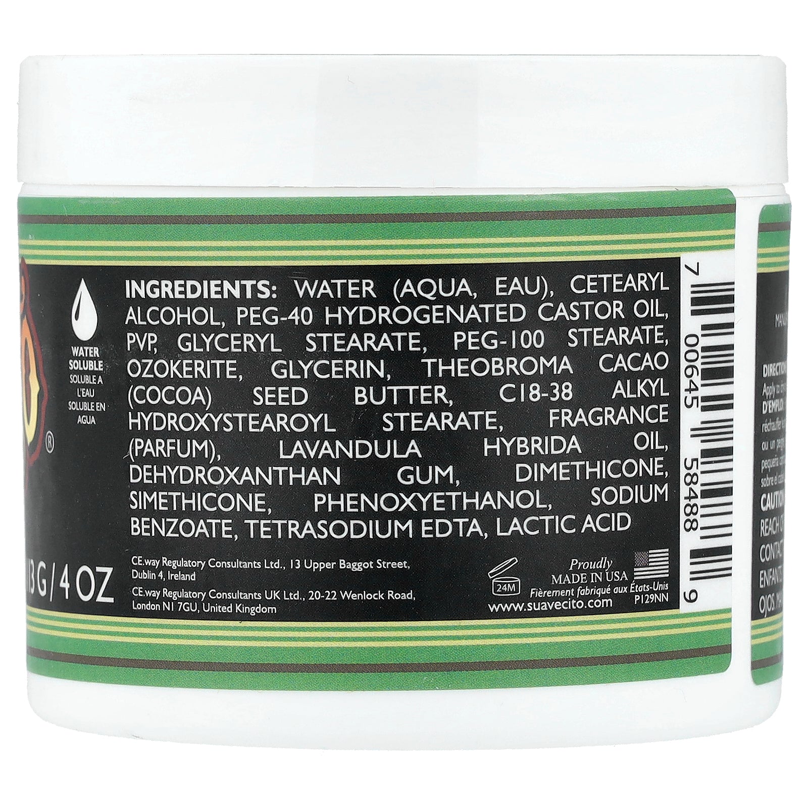 Water (aqua, eau), cetearyl alcohol, peg-40 hydrogenated castor oil, pvp, glyceryl stearate, peg-100 stearate, ozokerite, glycerin theobroma cacao (cocoa) seed butter, c18-38 alkyl hydroxystearoyl stearate, fragrance (parfum), lavandula hybrida oil, dehydroxanthan gum, dimethicone, simethicone, phenoxyethanol, sodium benzoate, tetrasodium edta, lactic acid.