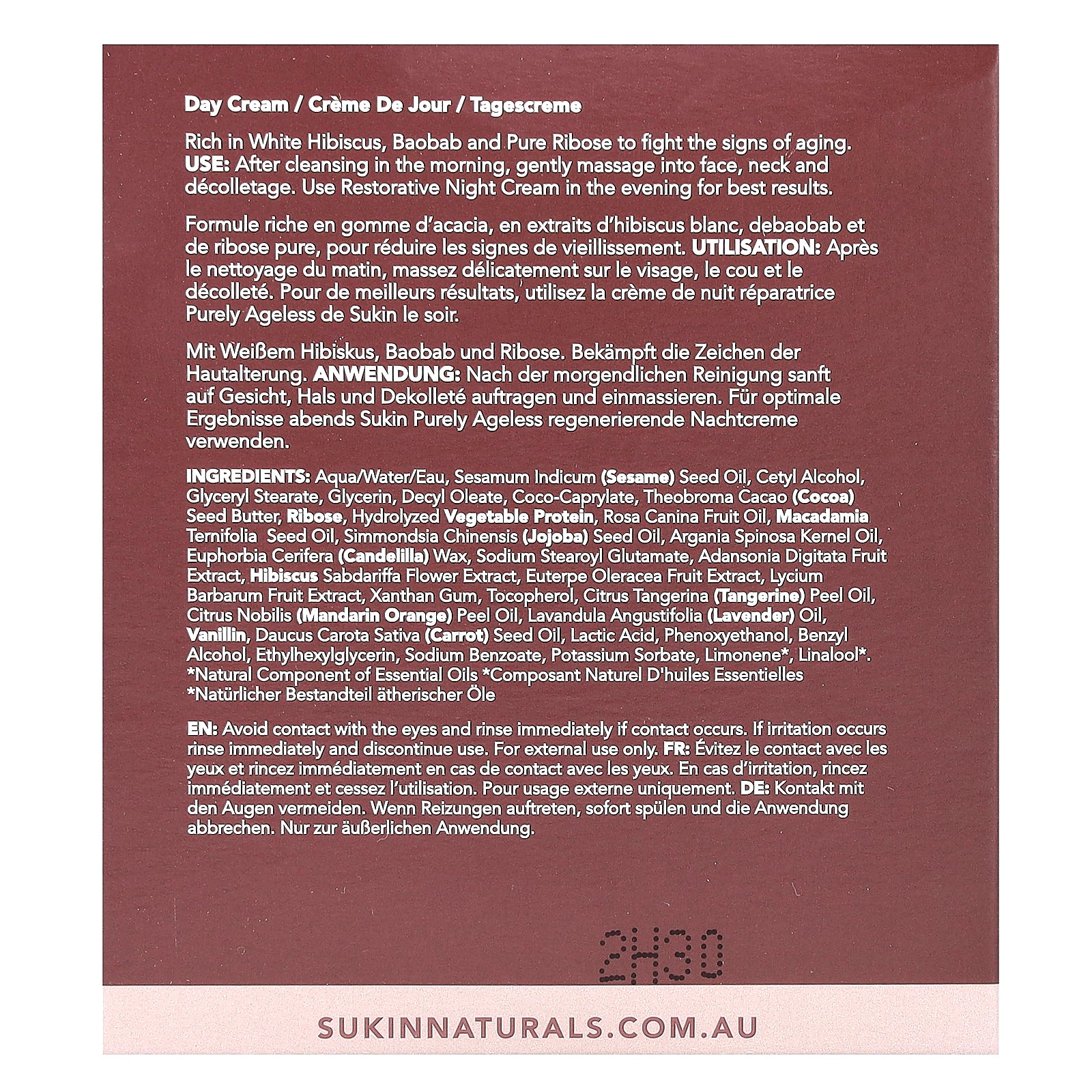 Water, sesamum indicum (sesame) seed oil, cetyl alcohol, glyceryl stearate, glycerin, decyl oleate, coco-caprylate, theobroma cacao (cocoa) seed butter, ribose, hydrolyzed vegetable protein, rosa canina fruit oil, macadamia ternifolia seed oil, simmondsia chinensis (jojoba) seed oil, argania spinosa kernel oil, euphorbia cerifera (candelilla) wax, sodium stearoyl glutamate, adansonia digitata fruit extract, hibiscus sabdariffa flower extract, euterpe oleracea fruit extract, lycium barbarum fruit extract, xanthan gum, tocopherol, citrus tangerina (tangerine) peel oil, citrus nobilis (mandarin orange) peel oil, lavandula angustifolia (lavender) oil, vanillin, daucus carota sativa (carrot) seed oil, lactic acid, phenoxyethanol, benzyl alcohol, ethylhexylglycerin, sodium benzoate, potassium sorbate, limonene*, linalool*.
