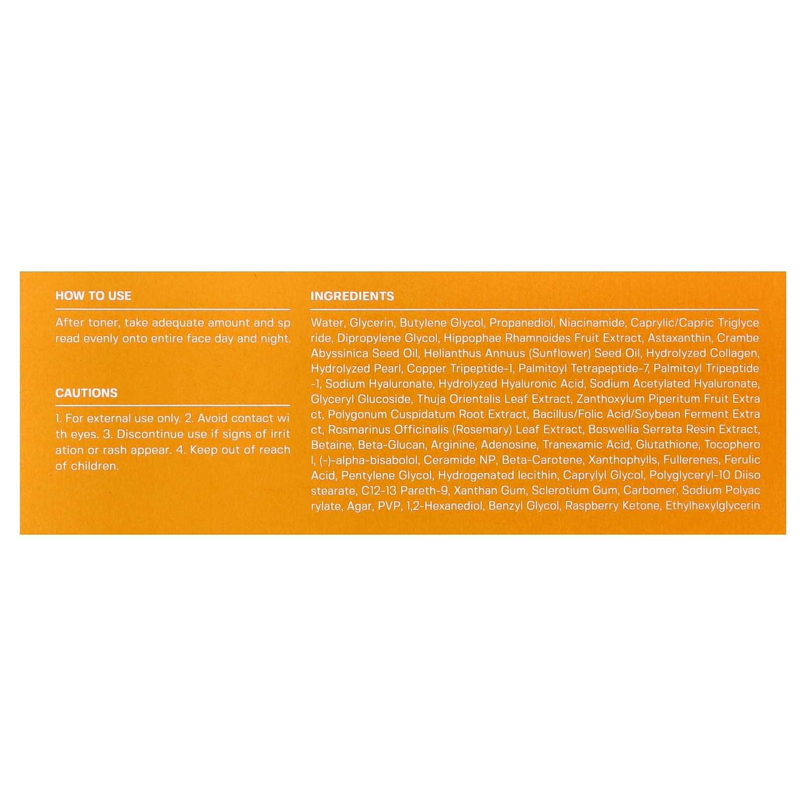Water, glycerin, butylene glycol, propanediol, niacinamide, caprylic/capric triglyceride, dipropylene glycol, hippophae rhamnoides fruit extract, astaxanthin, crambe abyssinica seed oil, helianthus annuus (sunflower) seed oil, hydrolyzed collagen, hydrolyzed pearl, copper tripeptide-1, palmitoyl tetrapeptide-7, palmitoyl tripeptide -1, sodium hyaluronate, hydrolyzed hyaluronic acid, sodium acetylated hyaluronate, glyceryl glucoside, thuja orientalis leaf extract, zanthoxylum piperitum fruit extract, polygonum cuspidatum root extract, bacillus/folic acid/soybean ferment extract, rosmarinus officinalis (rosemary) leaf extract, boswellia serrata resin extract, betaine, beta-glucan, arginine, adenosine, tranexamic acid, glutathione, tocopherol, (-)-alpha-bisabolol, ceramide np, beta-carotene, xanthophylls, fullerenes, ferulic acid, pentylene glycol, hydrogenated lecithin, caprylyl glycol, polyglyceryl-10 diisostearate, c12-13 pareth-9, xanthan gum, sclerotium gum, carbomer, sodium polyacrylate, agar, pvp, 1,2-hexanediol, benzyl glycol, raspberry ketone, ethylhexylglycerin.