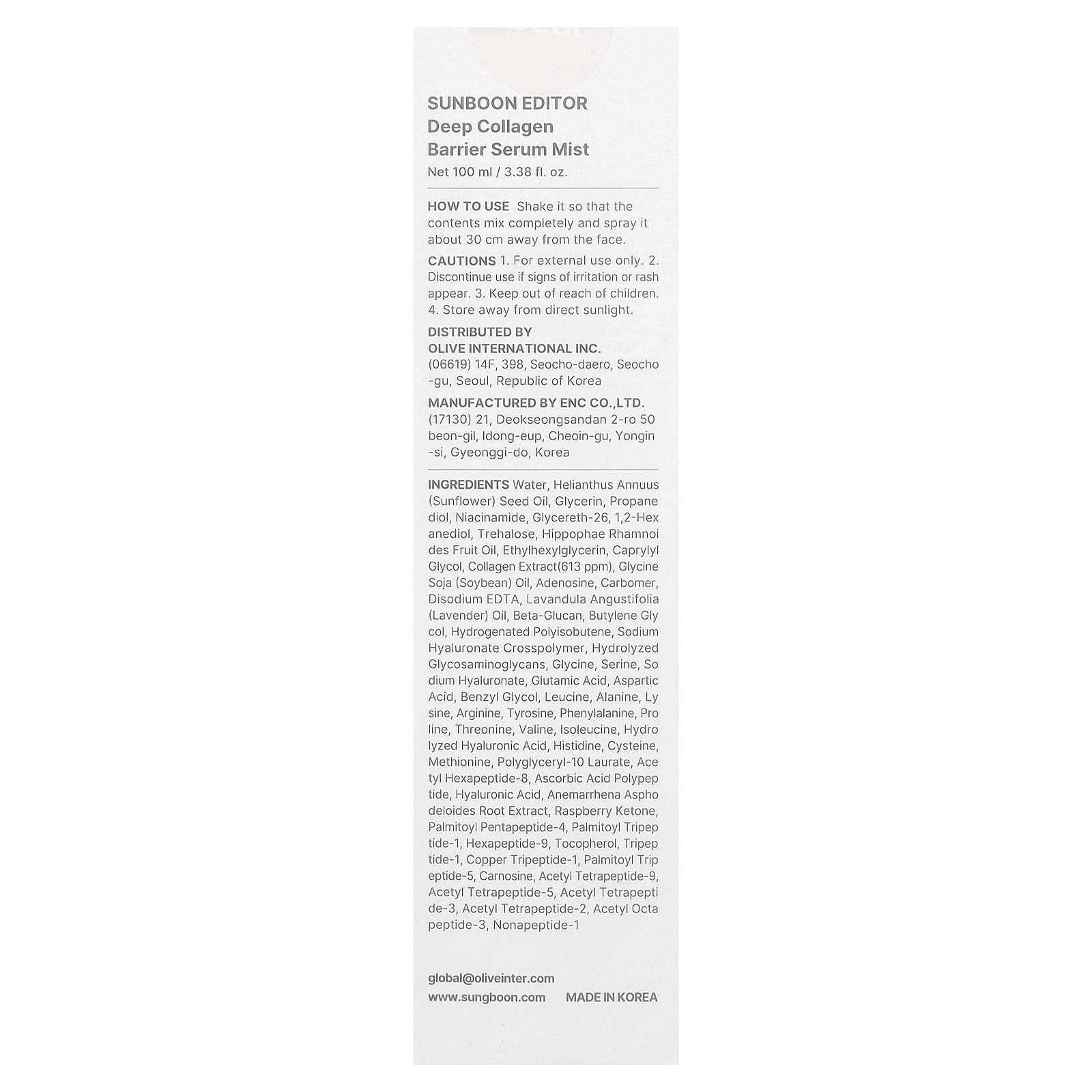 Water, helianthus annuus (sunflower) seed oil, glycerin, propanediol, niacinamide, glycereth-26, 1,2-hexanediol, trehalose, hippophae rhamnoides fruit oil, ethylhexylglycerin, caprylyl glycol, collagen extract(613 ppm), glycine soja (soybean) oil, adenosine, carbomer, disodium edta, lavandula angustifolia (lavender) oil, beta-glucan, butylene glycol, hydrogenated polyisobutene, sodium hyaluronate crosspolymer, hydrolyzed glycosaminoglycans, glycine, serine, sodium hyaluronate, glutamic acid, aspartic acid, benzyl glycol, leucine, alanine, lysine, arginine, tyrosine, phenylalanine, proline, threonine, valine, isoleucine, hydrolyzed hyaluronic acid, histidine, cysteine, methionine, polyglyceryl-10 laurate, acetyl hexapeptide-8, ascorbic acid polypeptide, hyaluronic acid, anemarrhena asphodeloides root extract, raspberry ketone, palmitoyl pentapeptide-4, palmitoyl tripeptide-1, hexapeptide-9, tocopherol, tripeptide-1, copper tripeptide-1, palmitoyl tripeptide-5, carnosine, acetyl tetrapeptide-9, acetyl tetrapeptide-5, acetyl tetrapeptide-3, acetyl tetrapeptide-2, acetyl octapeptide-3, nonapeptide-1.